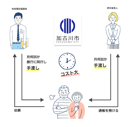 この場合、「お金を渡す」ことだけが主の目的となってしまい、本来の利用者宅での見守り等に充てる時間の確保が困難となっています。またコロナ禍において、現在の運用体制では、利用者と支援専門職員との接触によるリスクも起こり得ます。