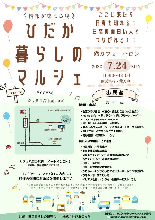 株式会社ぴあのっち(埼玉県日高市、代表取締役 齋藤由貴)は、2022年7月24日に開催予定の“ここに来たら日高を知れる・日高の面白い人とつながれる”『ひだか暮らしのマルシェ』を共同主催します。