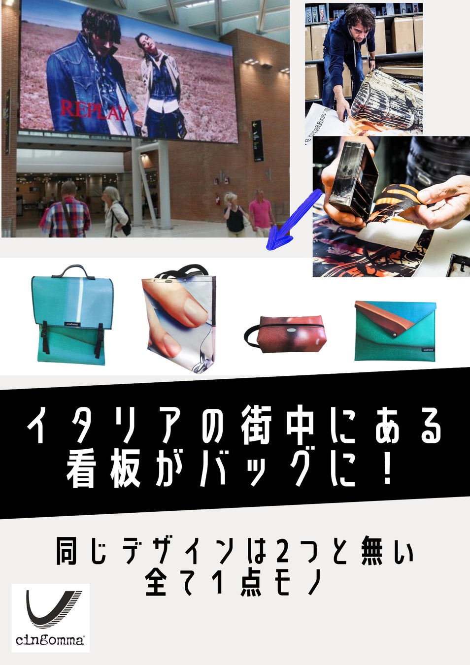 <写真左>イタリアの街頭にある看板の表面素材から作られたバッグパック。カッティングする箇所や広告の種類により様々な表情を見せてくれる。
