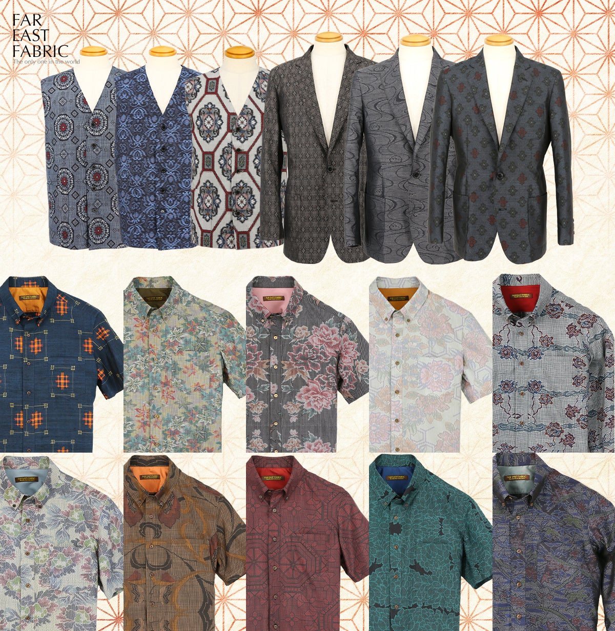 FAR EAST FABRIC」は使われなくなった着物をシャツやジャケットに蘇らせるリメイクメーカーです。美しい着物が使われずにいることや廃棄されてしまっている着物の厳しい現実に何とか再利用できる道はないかと日々模索しながら創作してきました。一点一点、糸ほどきから、お仕立てまでを全て手仕事で行っています。また全ての着物が一点物なため、私達が手がけるリメイク品は全てが世界に一つだけの一点物になります。
