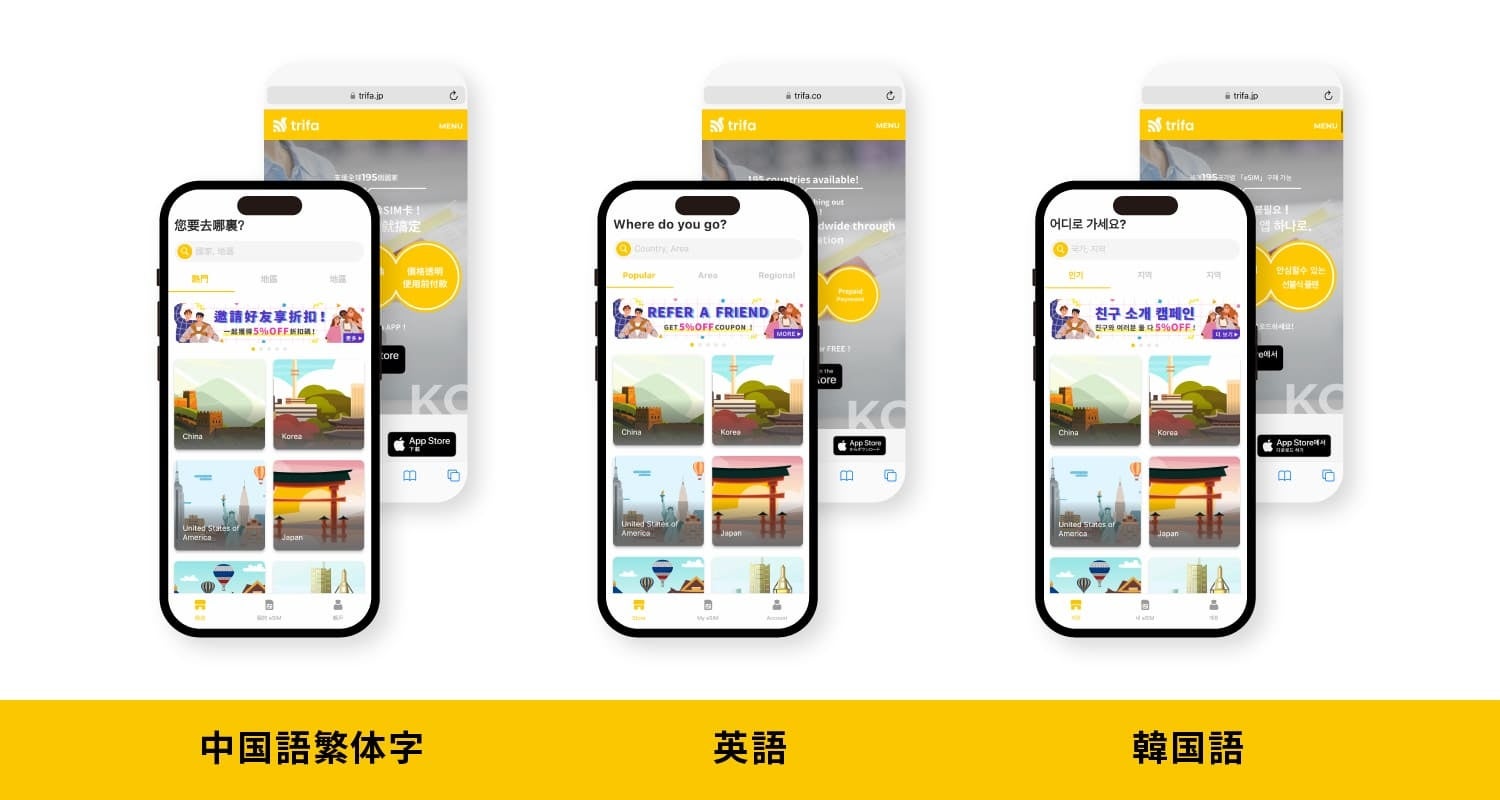 英語、韓国語、中国語繁体字が実装されたことで「trifa」はより多くの外国人が親しみやすいアプリになりました。これからもよりグローバルな視点で世界中の方へシームレスでストレスフリーな旅行体験を提供できるようサービス拡充していく方針です。