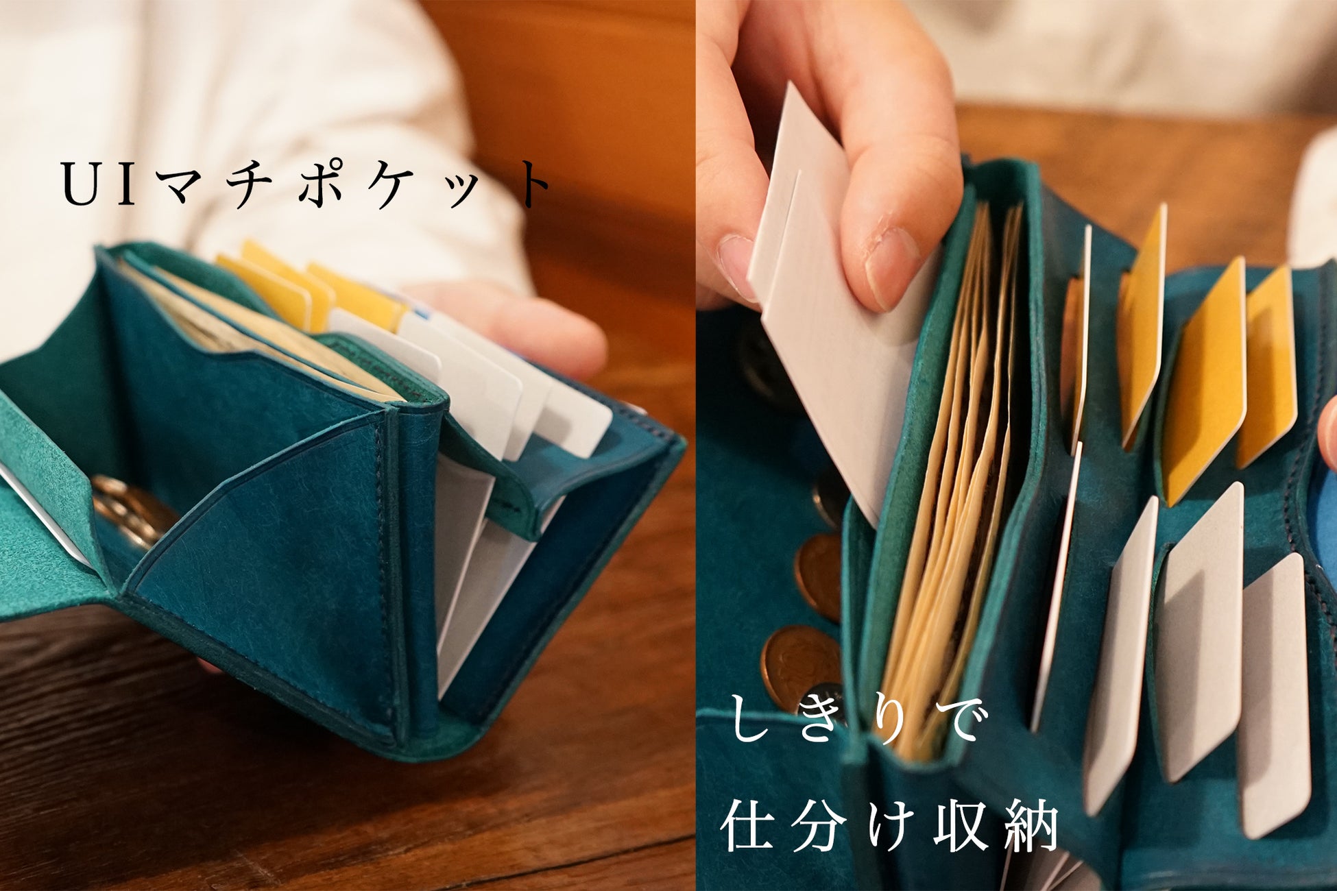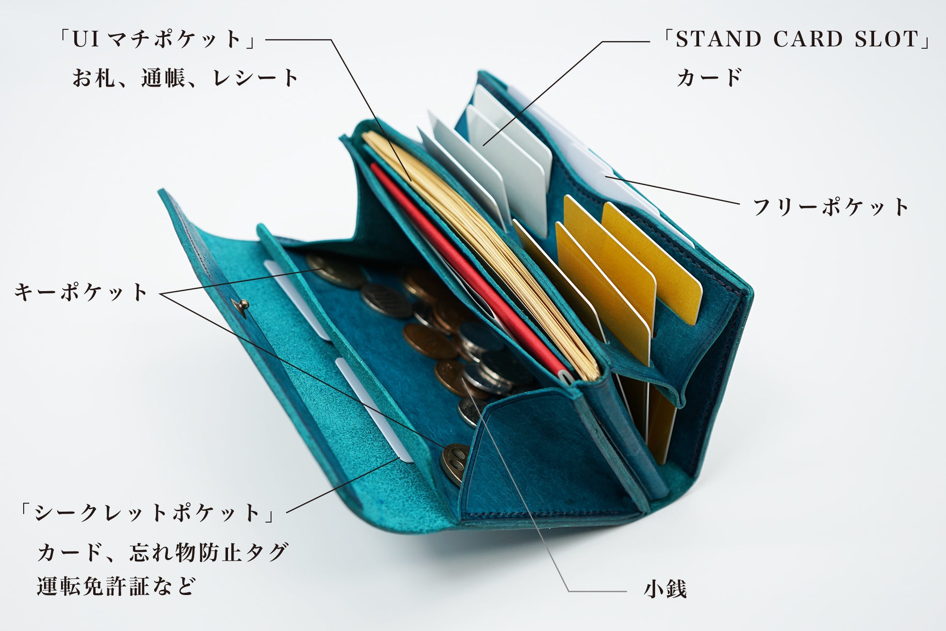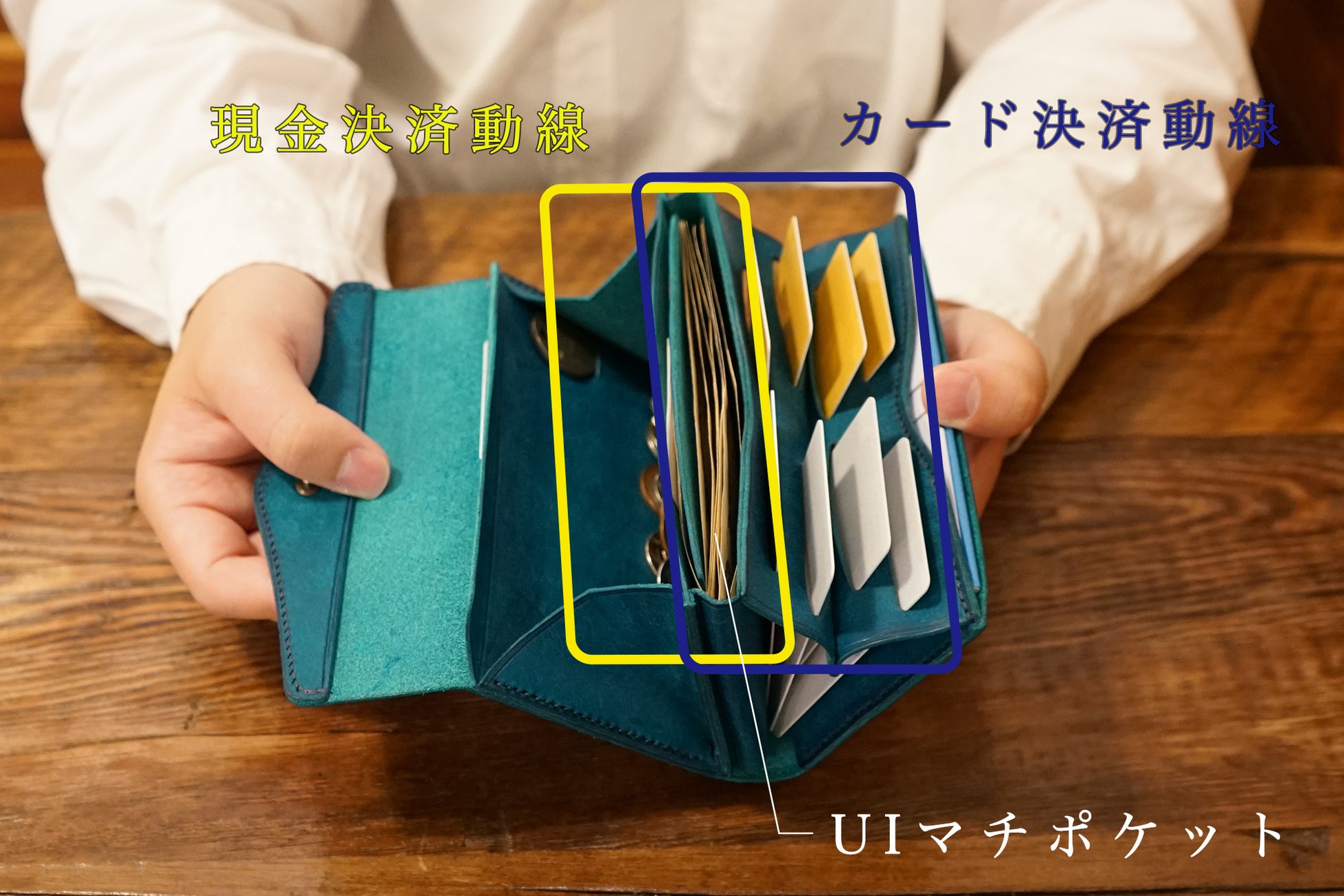 お札・レシートを入れるポケットは、横幅を抑えながら一万円札をスムーズに出し入れできる新構造のUIマチポケット。財布自体の厚みを出しすぎることなく、お札の出し入れがしやすくMAXで紙幣を30枚も収納可能。さらに通帳も収納できます。(通帳を入れなければ、紙幣はMAX50枚ほど入ります。)