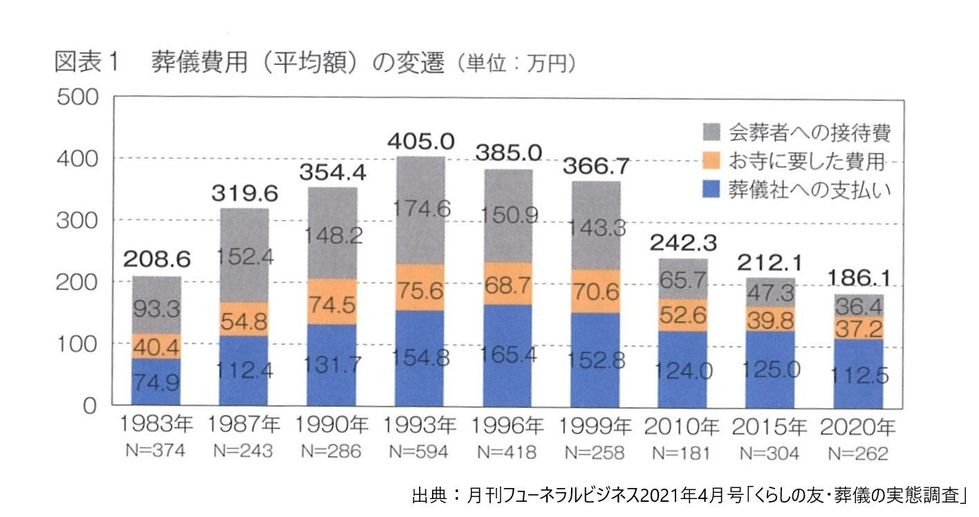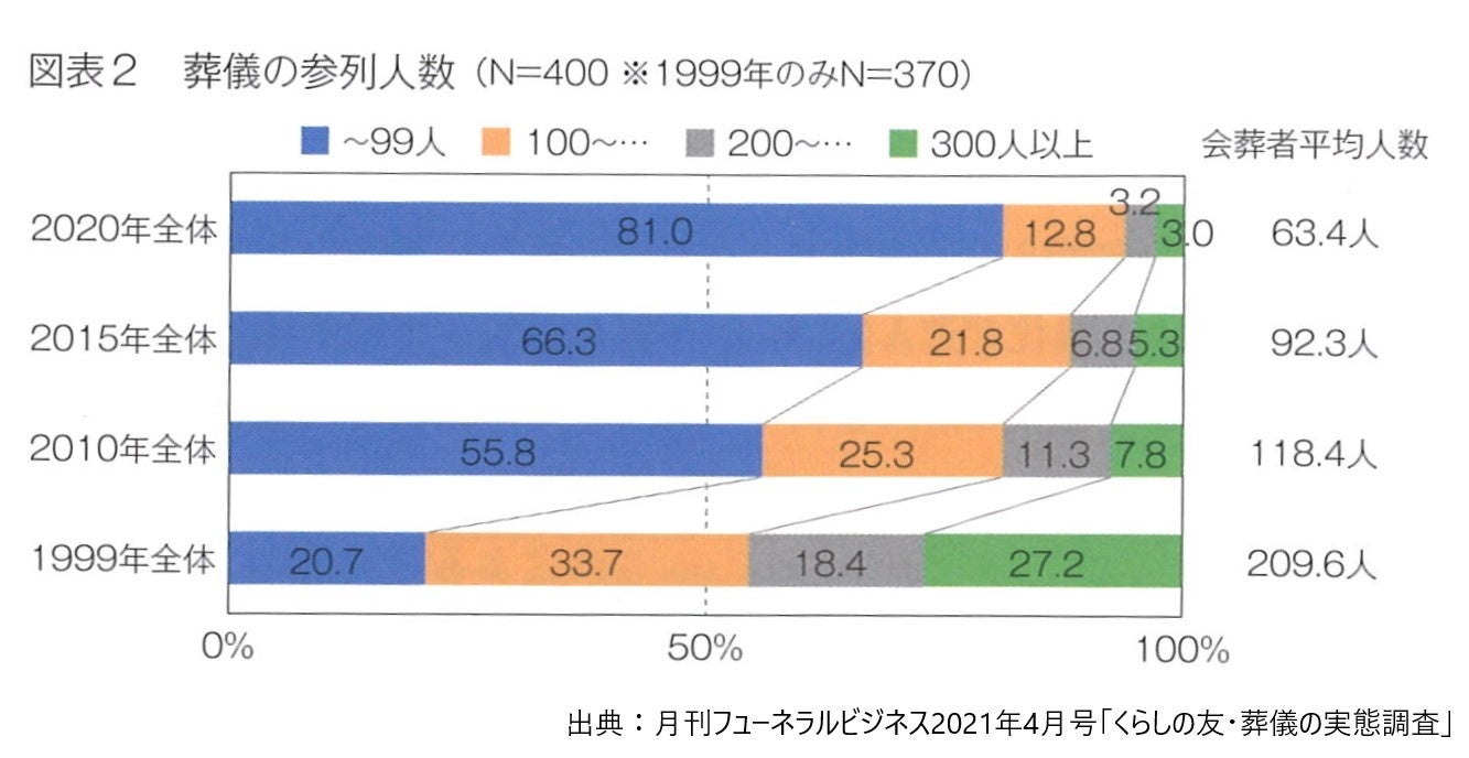 葬儀規模が年々縮小傾向にある中、コロナ禍での人数制限への意識が大きく影響し、参列者が少ない葬儀傾向が急速に拡大しました。また、葬儀の規模が小さくなることで、会葬者への接待費の負担は大きく減少傾向にあることが分かります。