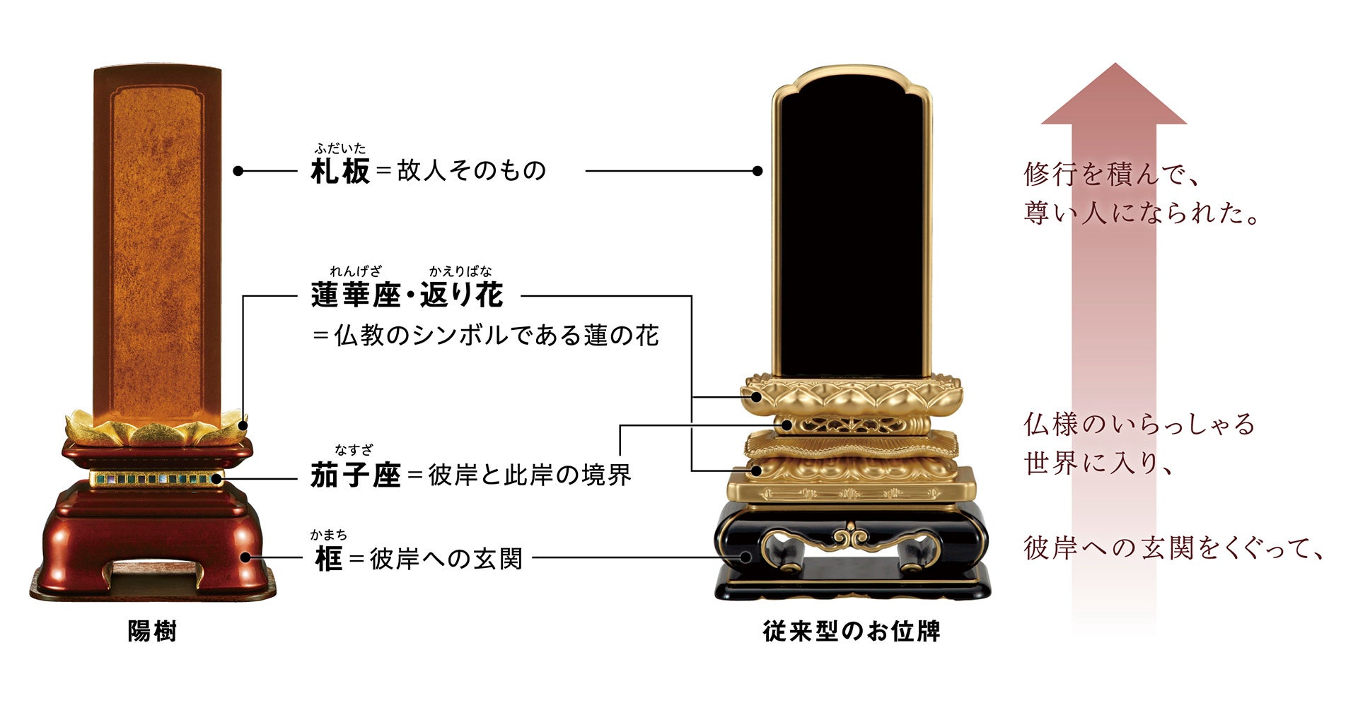 現代のお位牌はお仏壇の洋風化に合わせ、パーツが簡略化される場合もありますが、「陽樹」はお位牌に込められた本来の意味合いを大切に残し、デザインしました。