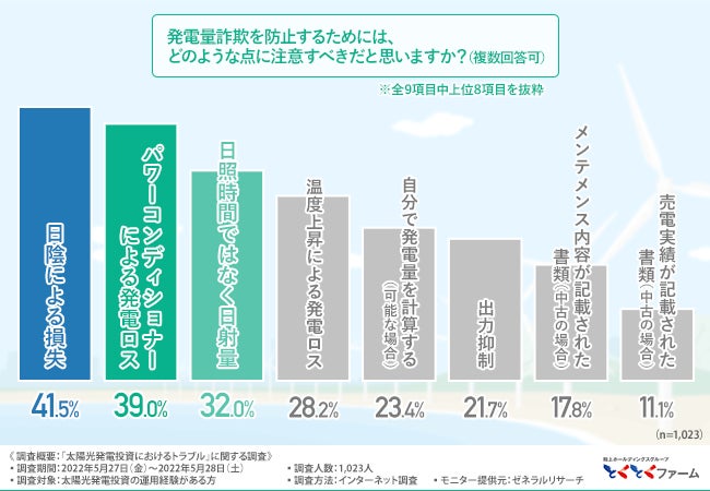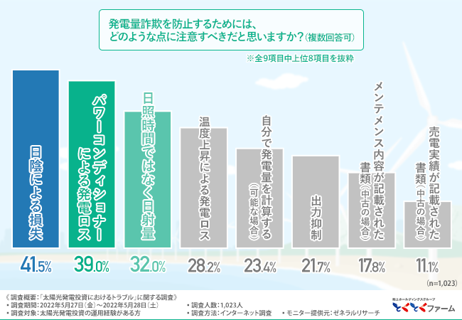 続いて、「発電量詐欺を防止するためには、どのような点に注意すべきだと思いますか?(複数回答可)」と質問したところ、『日陰による損失(41.5%)』と回答した方が最も多く、次いで『パワーコンディショナーによる発電ロス(39.0%)』『日照時間ではなく日射量(32.0%)』『温度上昇による発電ロス(28.2%)』『自分で発電量を計算する(可能な場合)(23.4%)』『出力抑制(21.7%)』『メンテナンス内容が記載された書類(中古の場合)(17.8%)』『売電実績が記載された書類(中古の場合)(11.1%)』と続きました。