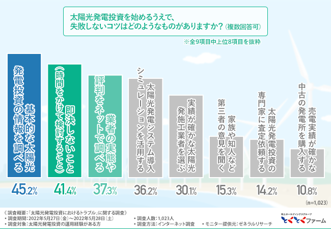 「太陽光発電投資を始めるうえで、失敗しないコツはどのようなものがありますか?(複数回答可)」と質問したところ、『基本的な太陽光発電投資の情報を調べる(45.2%)』と回答した方が最も多く、次いで『即決しないこと(時間をかけて検討すること)(41.4%)』『業者の実態や評判をネットで調べる(37.3%)』と続きました。