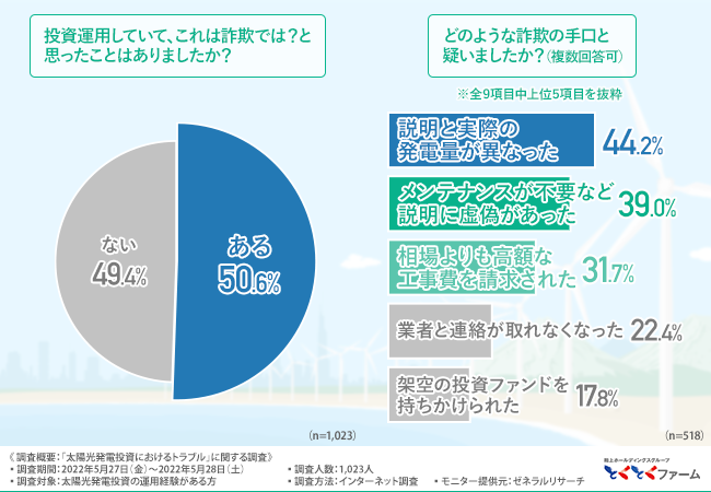 そこで、「どのような詐欺の手口と疑いましたか?(複数回答可)」と質問したところ、『説明と実際の発電量が異なった(44.2%)』と回答した方が最も多く、次いで『メンテナンスが不要など説明に虚偽があった(39.0%)』『相場よりも高額な工事費を請求された(31.7%)』『業者と連絡が取れなくなった(22.4%)』『架空の投資ファンドを持ちかけられた(17.8%)』と続きました。