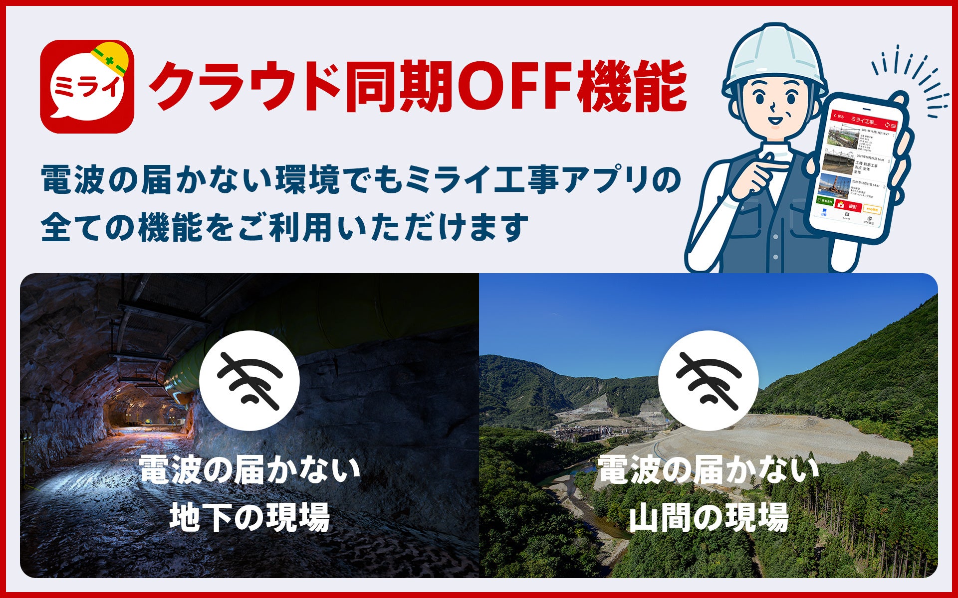 クラウド工事写真アプリ「ミライ工事」を提供する株式会社ミライ工事:代表取締役社長 神山 庸、以下:当社)は、電波の届かない環境でも工事写真台帳をスマートフォンアプリで作成・編集ができる「クラウド同期OFF機能」をリリースしたことをお知らせいたします。