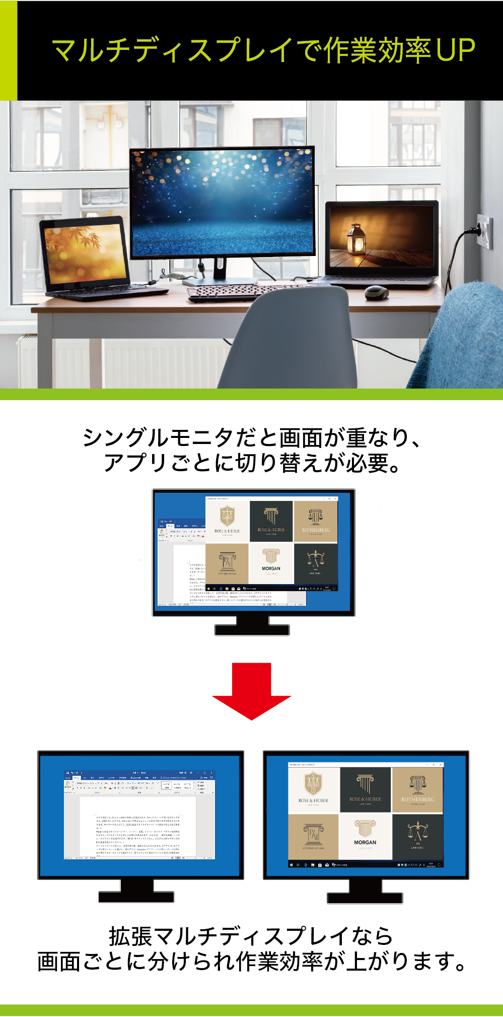 通常は複数のアプリケーションを開いていると、いくつものウィンドウが重なり、そのたびに下にあるウィンドウを上にするために選択するという操作を繰り返さなければなりません。《 MINIMAL STATION 》で「拡張マルチディスプレイモード」にすれば複数のウィンドウを表示できるので、面倒な操作が省けて作業効率が飛躍的に上がります。