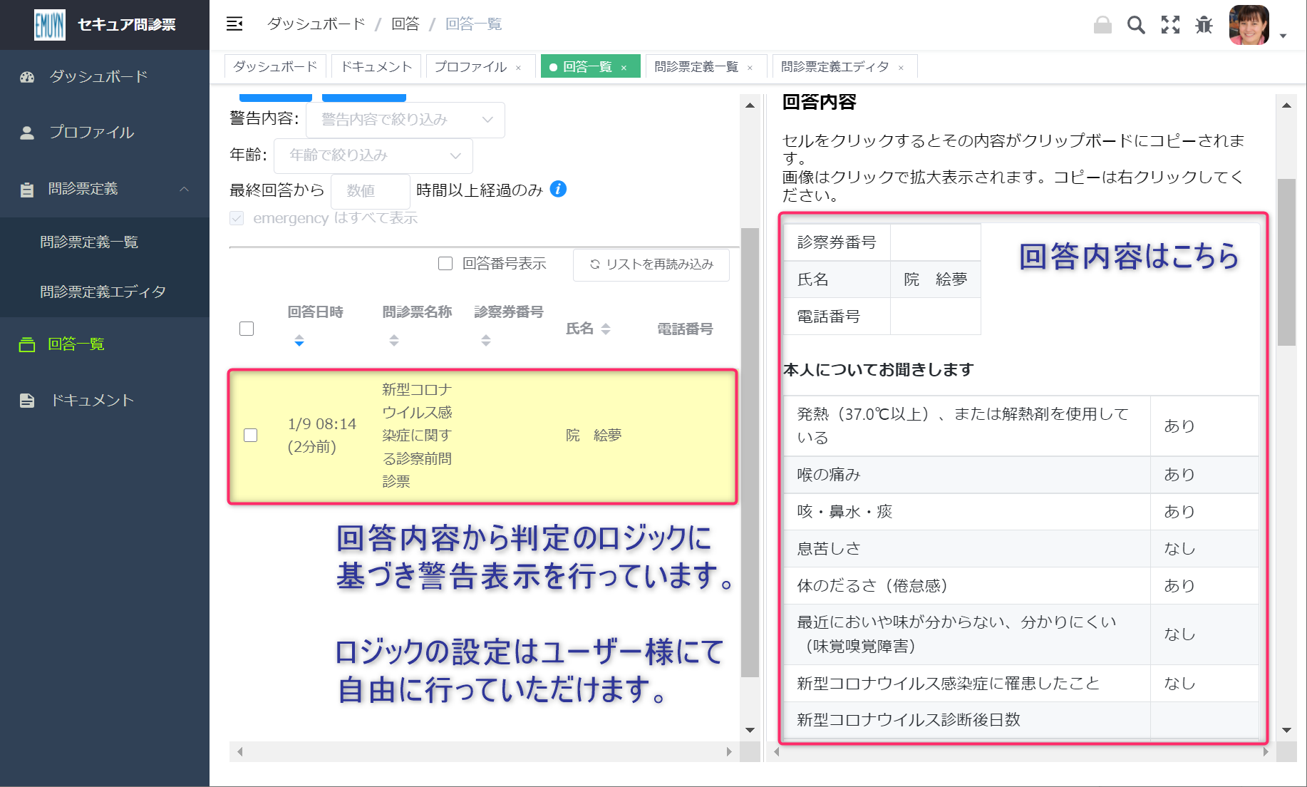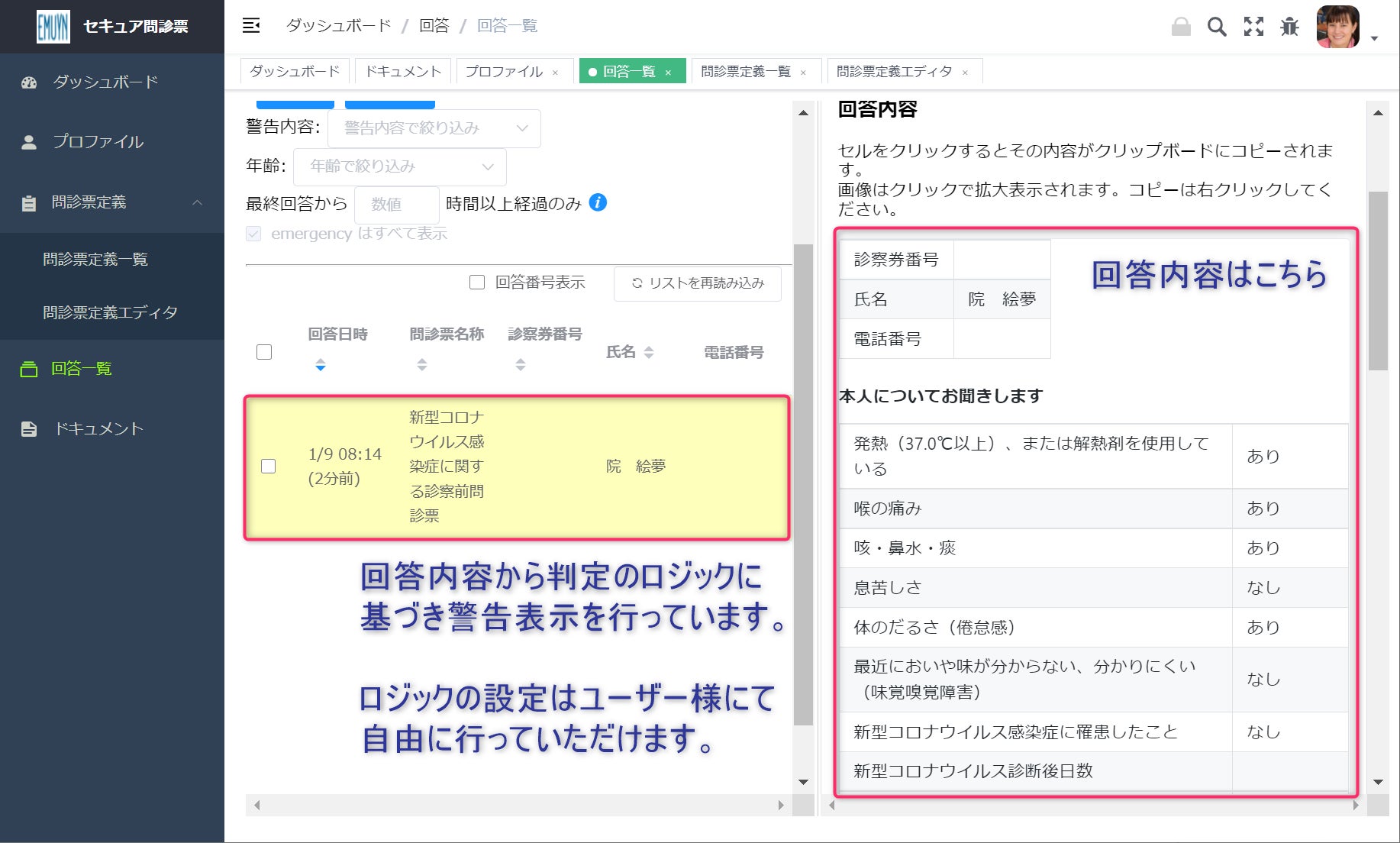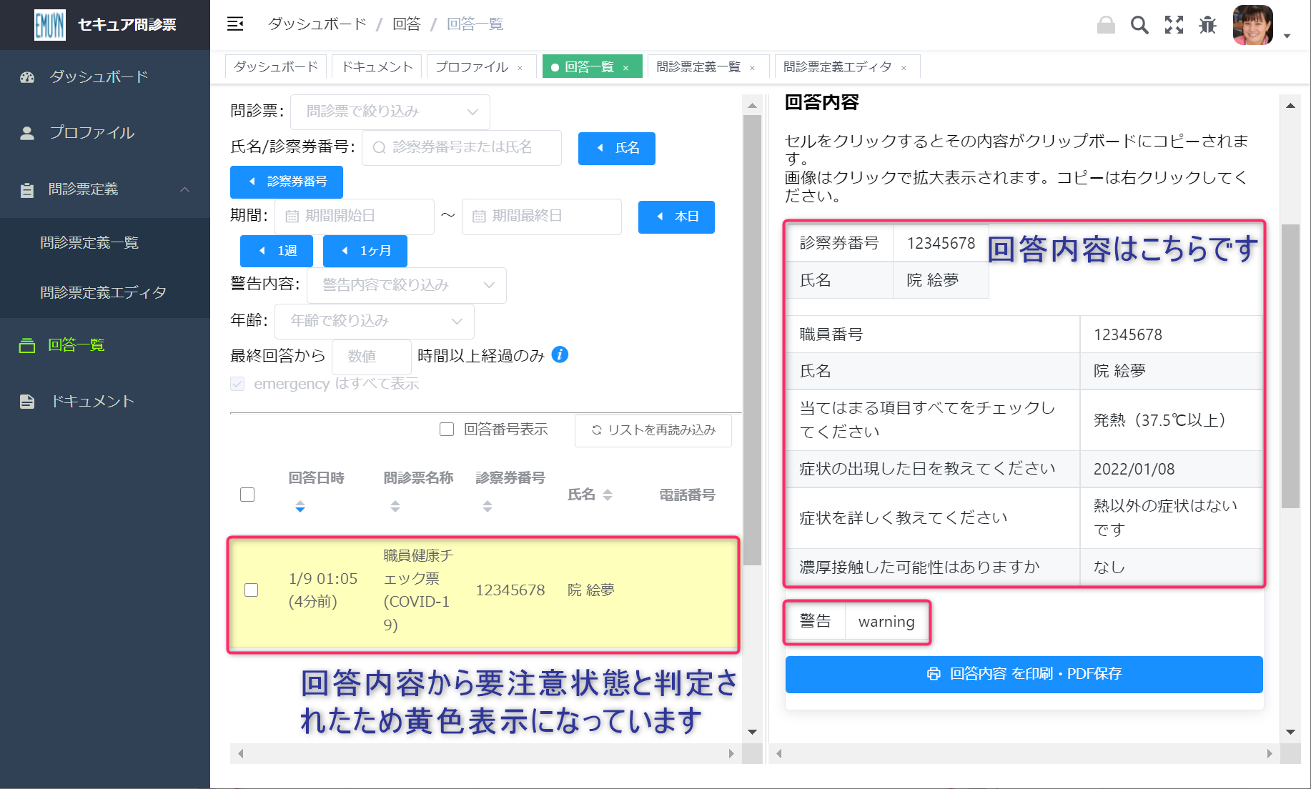 有症状もしくは濃厚接触の回答の場合には警告表示がなされるようになっていますので、すぐに対応することが可能です。