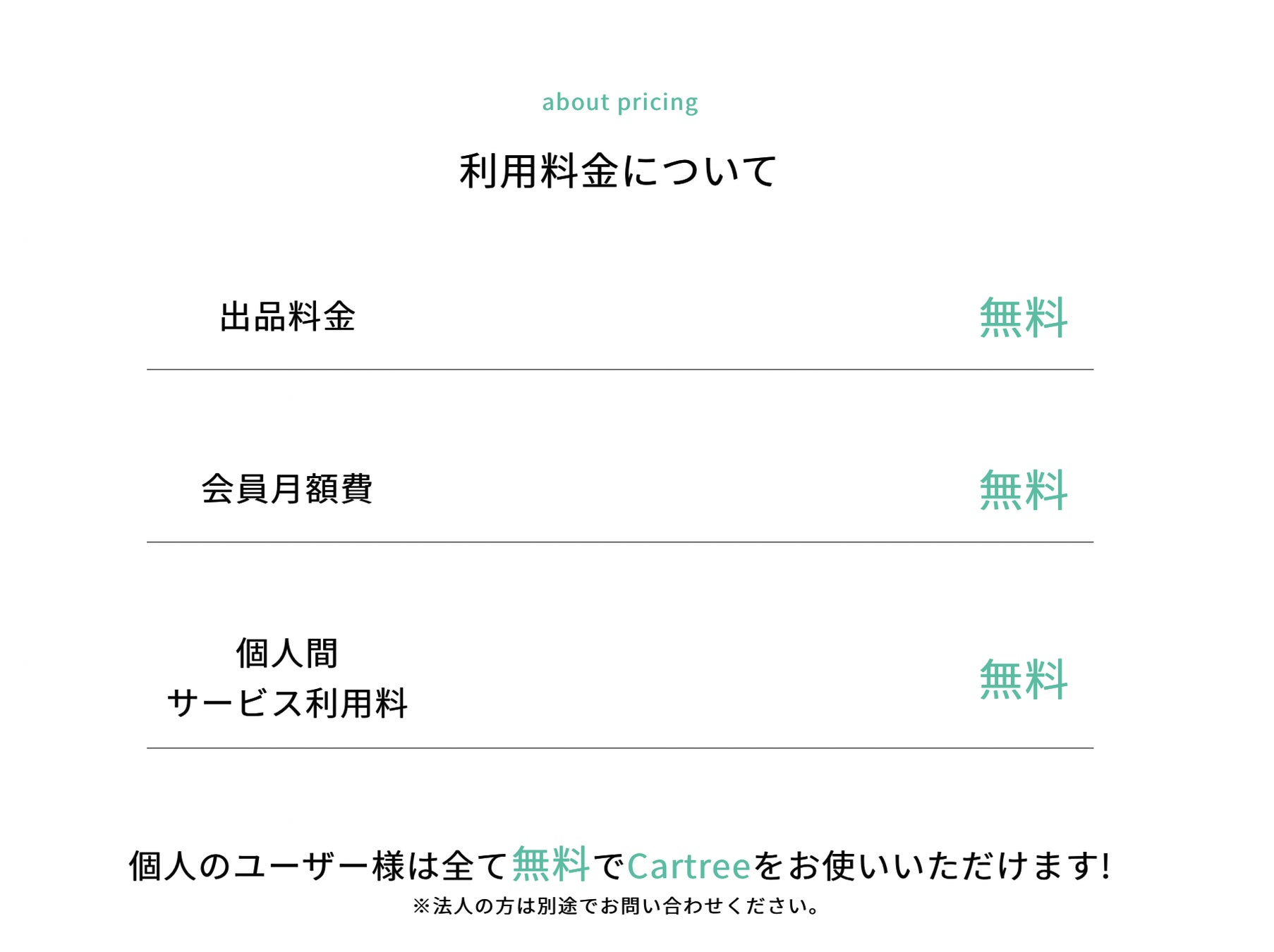 Cartreeでは、登録料金・掲載料金・月額費などは一切かかりません。