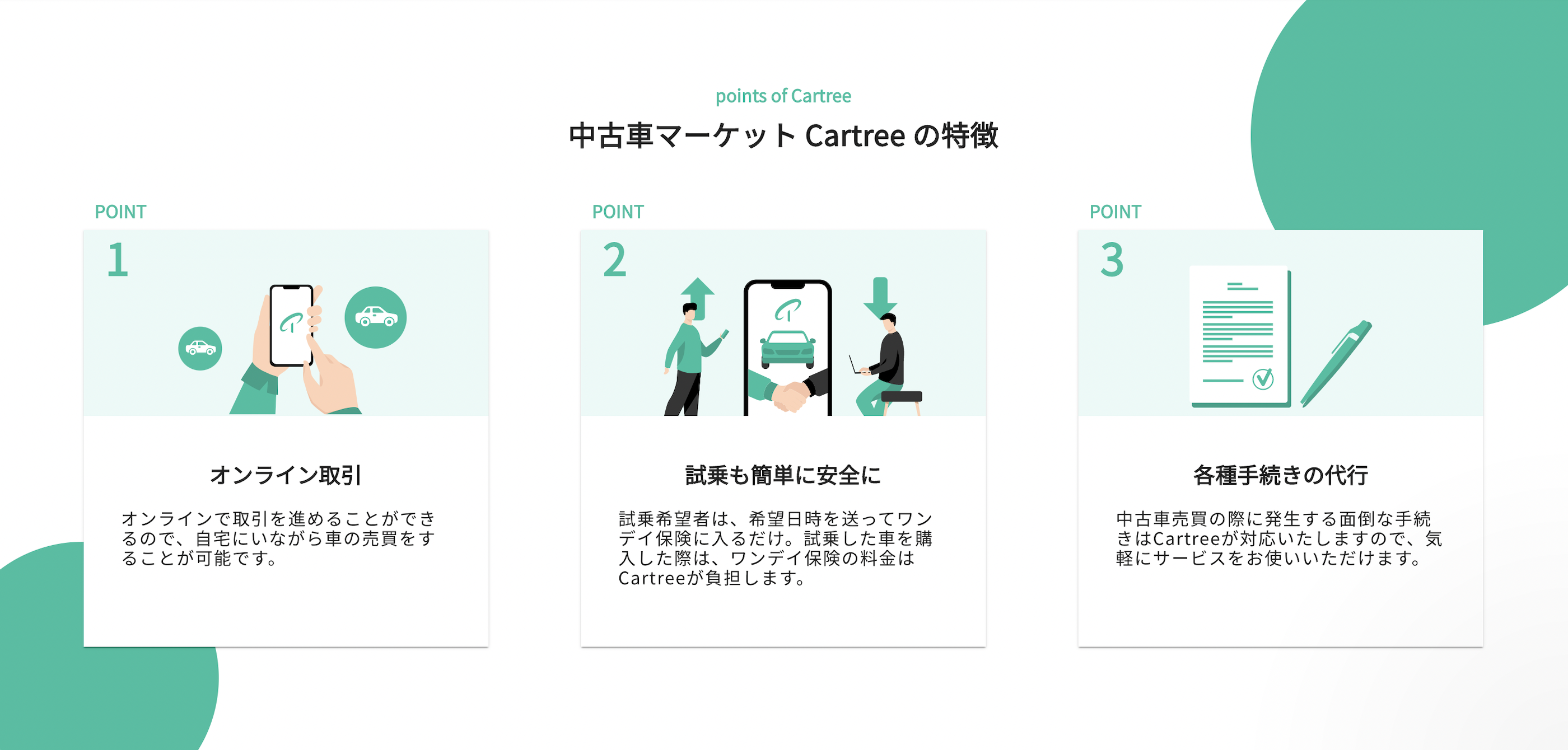 「Cartree」は、出品から納車まで全てオンラインで行うことができるオンライン中古車売買プラットフォーム。簡単に、そしてわかりやすく中古車を売買していただけるプラットフォームです。