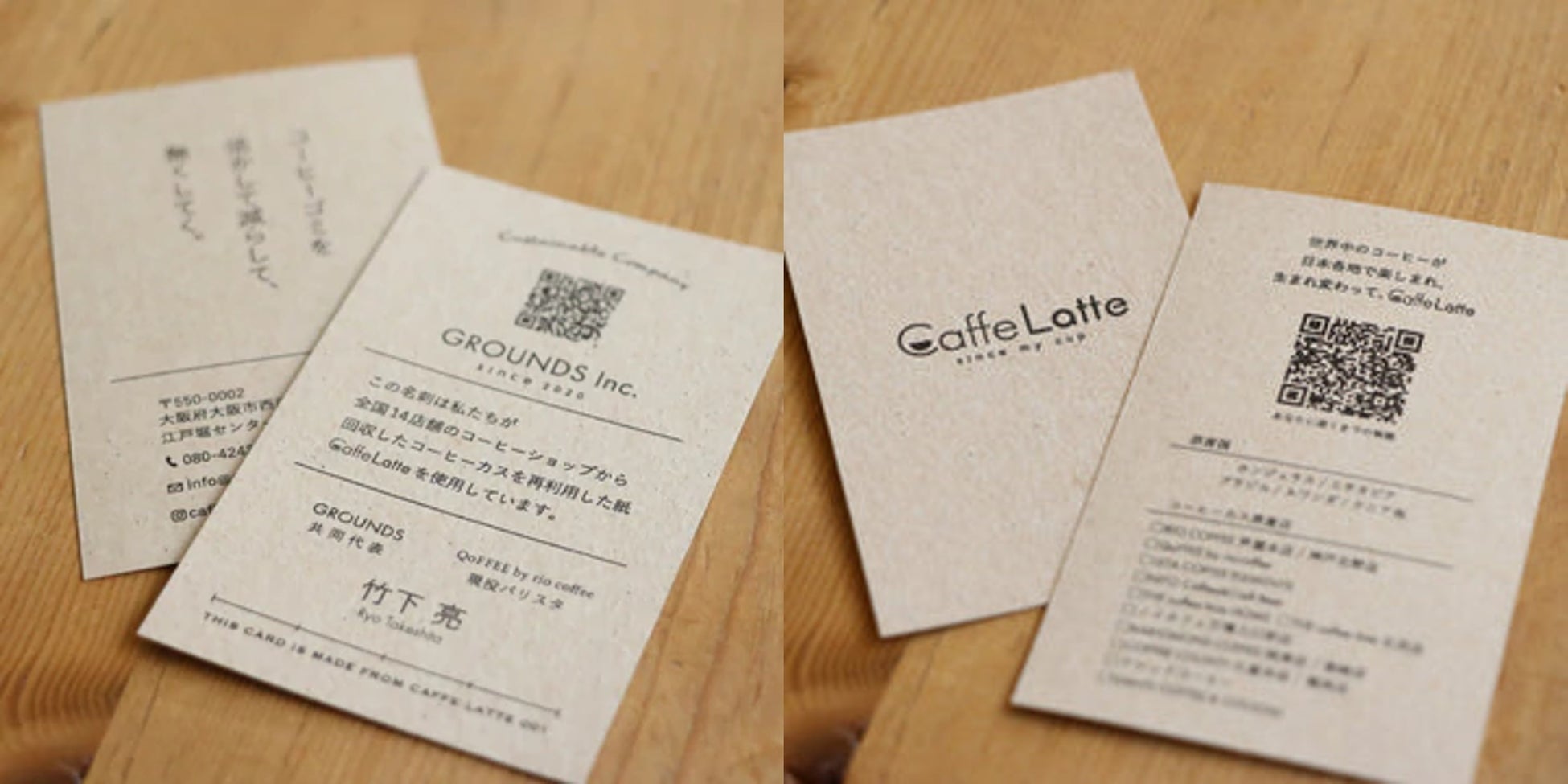 コーヒーカスを使った再生紙ブランド"CaffeLatte"を展開するGROUNDS合同会社(大阪市:代表 竹下 亮・鈴木雪姫)は、コーヒーカスの再生紙を使用したオリジナル名刺の作成サービスを5月4日の名刺の日から開始いたします。