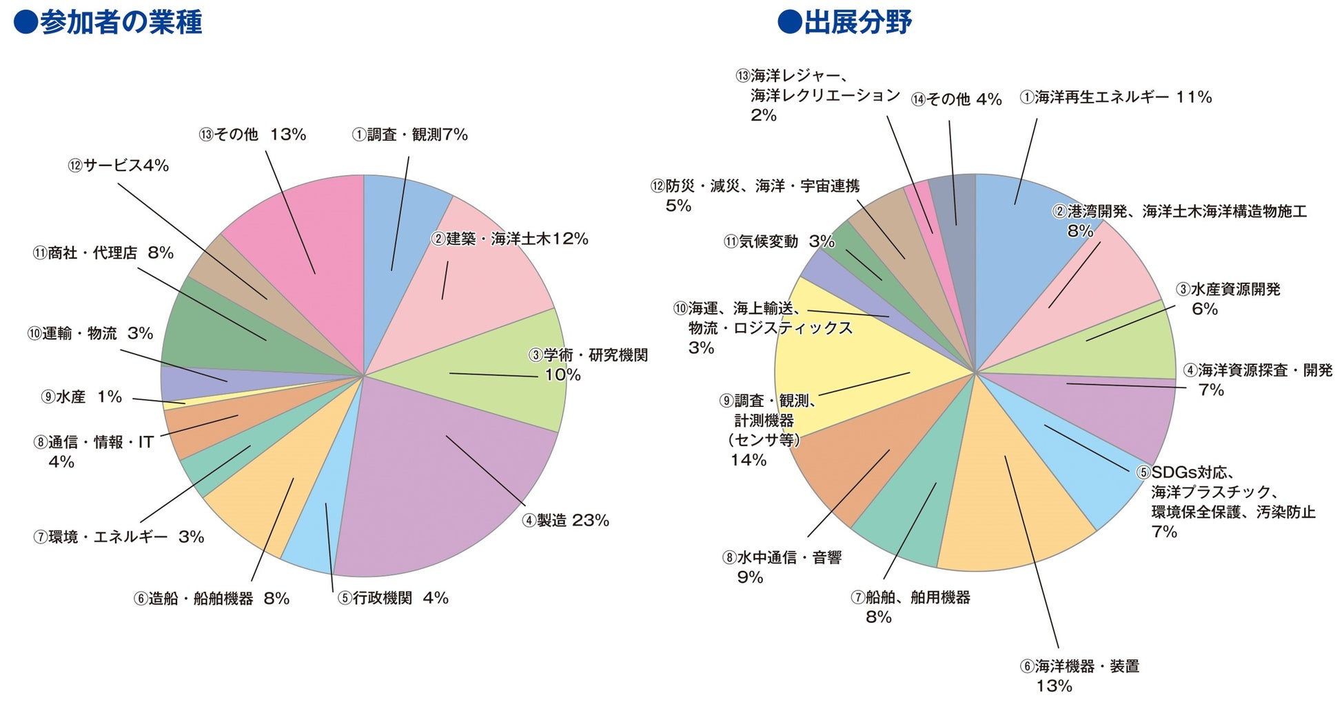 海洋再生可能エネルギー(洋上風力発電、波力・潮流発電、海洋温度差発電等)/港湾開発(カーボンニュートラルポート)・海洋土木・海洋構造物施工/水産資源開発(沖合養殖、漁場整備等)/海洋資源探査・開発(石油・天然ガス、メタンハイドレート、深海底鉱物資源等) /造船、舶用機器、舶用エンジン/海洋機器・装置(AUV, ROV, ASV, 水中ロボット、自律航行船等)/水中通信、海中音響(ソナー等) /調査・観測、計測機器(センサ等)/SDGs対応、海洋プラスチックごみ、環境アセスメント、環境保護・保全、汚染防止/測量・測量機器/海運、海上輸送、ロジスティックス/気候変動、気象観測、防災・減災、防衛、海洋・宇宙連携(衛星利用等)/海洋レジャー、海洋レクリエーション/その他 |