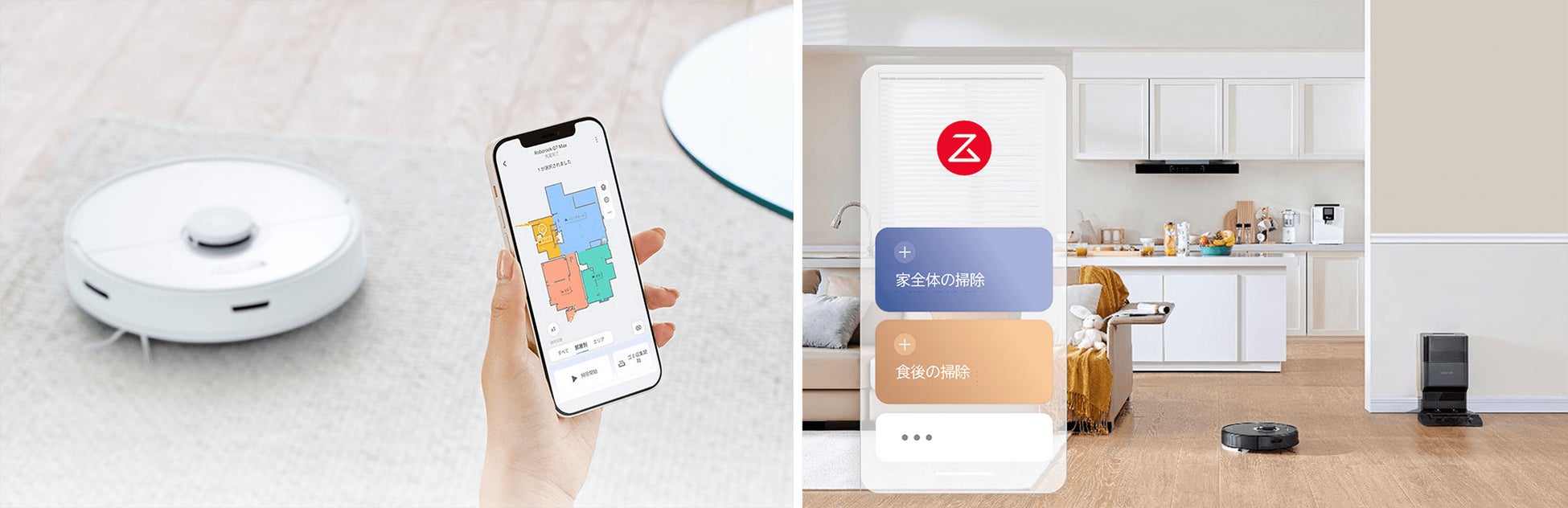 アプリを使用すれば、掃除ルートがリアルタイムで確認ができる他、部屋全体の掃除が終わるとアプリ上にマップが完成し、進入禁止エリアや掃除したい部屋・エリアの設定ができます。また、部屋ごとに掃除モードや掃除する部屋の順番をお好みで設定が可能です。さらに「食後の掃除」としてキッチンやダイニングなどの掃除エリアを登録しておくことで、生活ルーティンに合わせた掃除を行います。