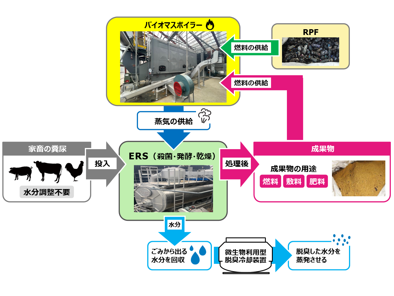 ERSシステムは、地域に生息する土着菌を活用し、家畜糞尿をわずか1日で殺菌・発酵・乾燥して資源化する画期的なシステムです。処理工程の全てにおいて排水や悪臭を発生しないこと及び処理後の成果物が燃料や敷料等に再利用できるのが最大のメリットです。