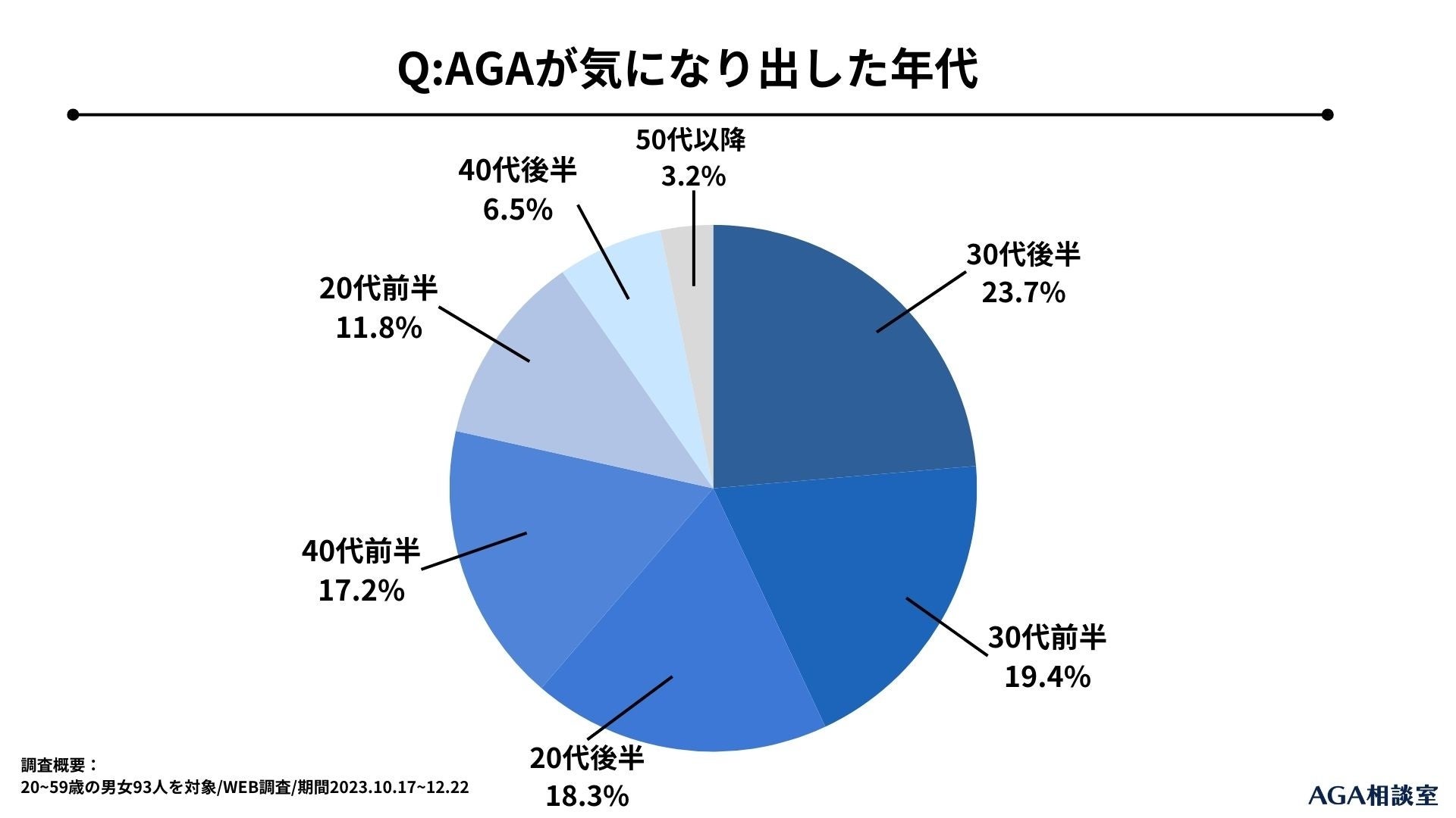 AGAが気になり出した年代は「30代後半」が23.7%、「30代前半」が19.4%と30代が最も多い結果となりました。