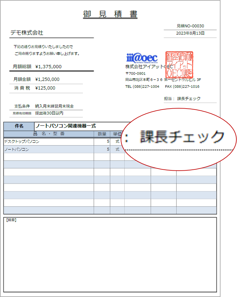 またステータス状況を帳票出力出来るようになったため、確実に決裁が終わっている見積なのか等の信頼性を付与する事が出来るようになりました。