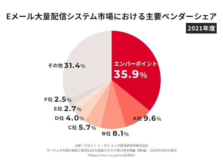 エンバーポイント株式会社(本社:東京都千代田区、代表取締役社長:神谷 勇樹、以下エンバーポイント)は、デロイト トーマツ ミック経済研究所株式会社が2022年9月9日に発行した市場調査レポート「マーテック市場の現状と展望2022年度版クラウド型CRM市場編 (第6版)」のEメール大量配信システム市場において、エンバーポイントが開発・提供するメール配信システム「Mail Publisher」が2021年度主要ベンダーシェアNo.1を獲得したことを発表いたします。