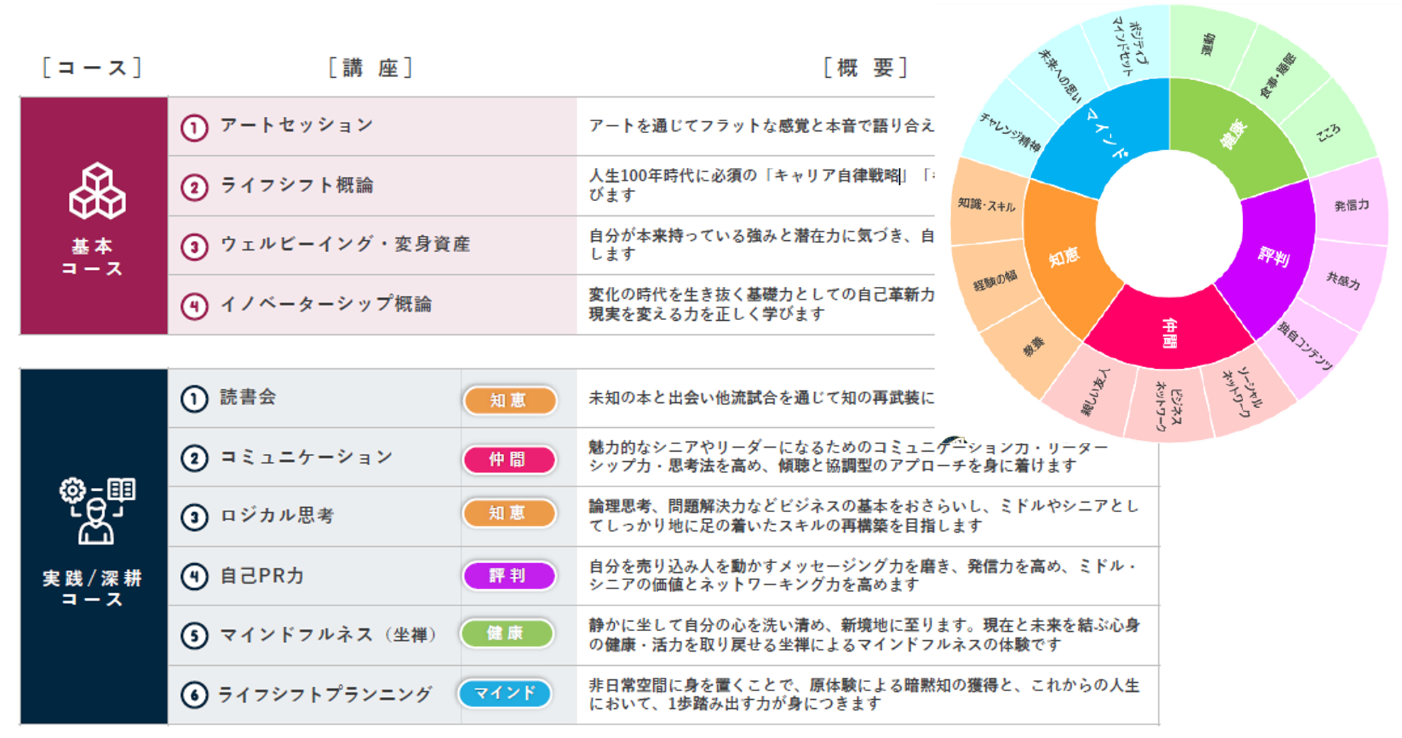 日本唯一のライフシフトに特化したキャンパス。ミドル・シニア層が80歳まで現役で活躍し、人生設計・キャリアデザインをできるようにライフシフト社が独自で開発した「変身資産コンセプト」に基づく5つの能力を伸ばすプログラム構成でカリキュラムを提供しています。