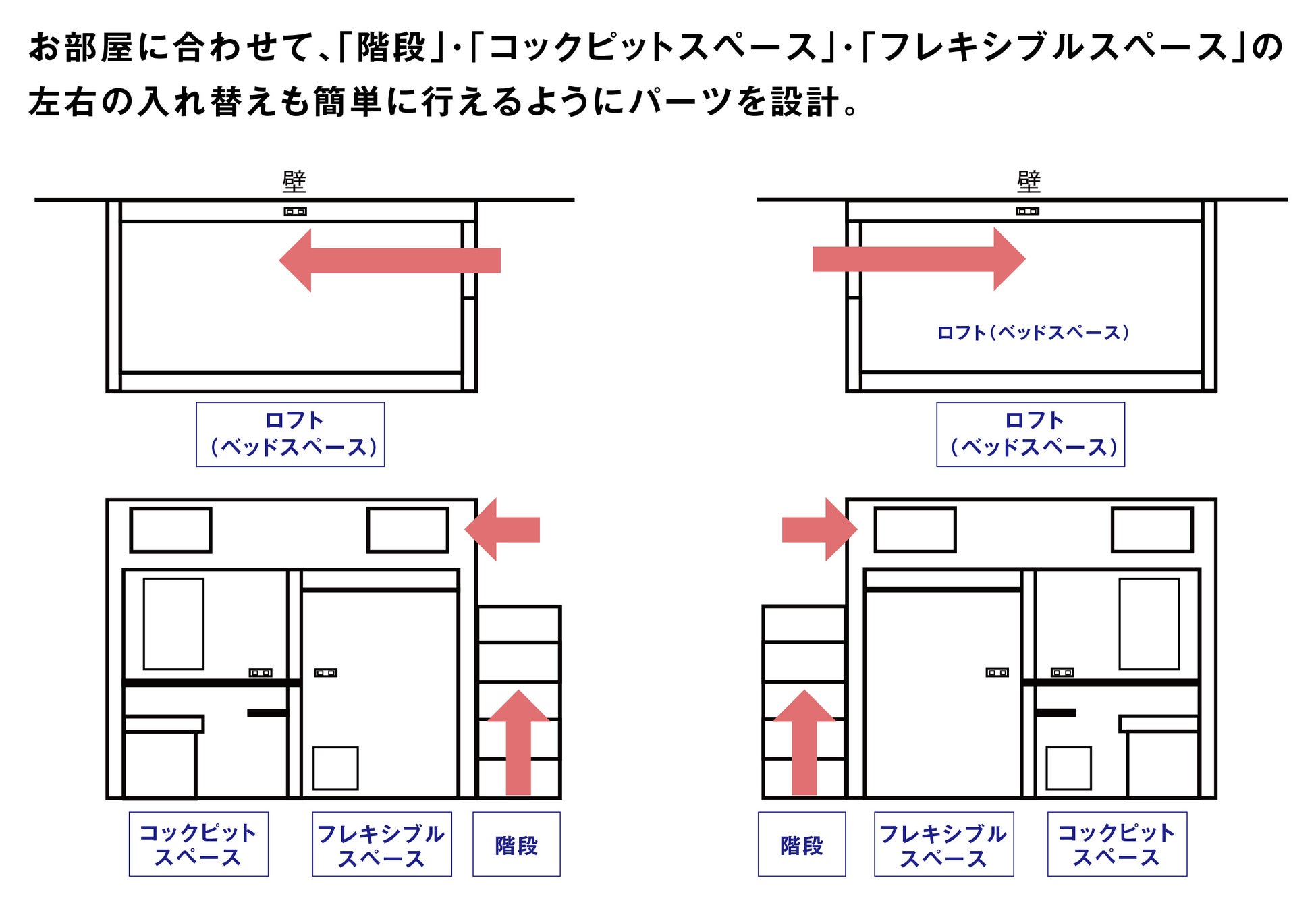 ベッドを置いただけの、寝るためだけの狭小空間を「快適」で「機能的」な居住空間に変えるための「ユニット家具」が『システム ロフト ユニット』。これまで平面的にしか利用していなかった空間を、立体的に利用する「ロフト構造のユニット」が限られた空間を可能な限り有効活用する事で、様々なライフスタイルを楽しめる空間へと革新します。ユニットの構成は上部ベッドスペース、下部に多機能ダイニング・ワークスペース、収納スペースなど組み合わせ・使い方も自由にできます。階段下収納やビューティーミラー設置など、最小約1.7帖のスペースに生活が完結できる様々な機能や工夫を搭載しています。また、「ロフト ユニット」を設置する事で生まれる余剰空間がこれまでにない「ゆとり」と「開放感」を生み出します。