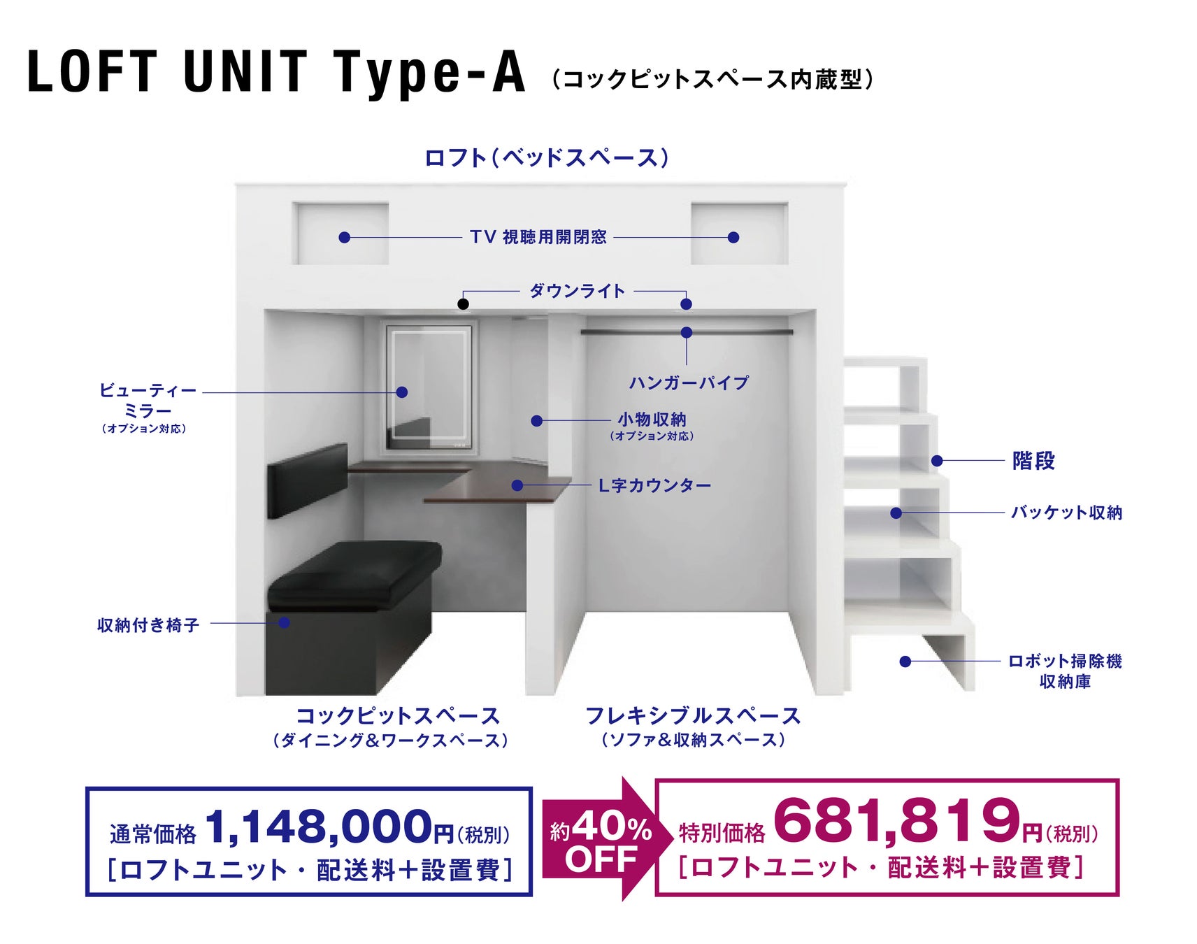 【特別価格でご提供】約1.7帖で生活が完結できる!特許庁内装意匠権取得『システム ロフト ユニット』の量産供給開始に伴い期間限定・40%OFFでご提供。