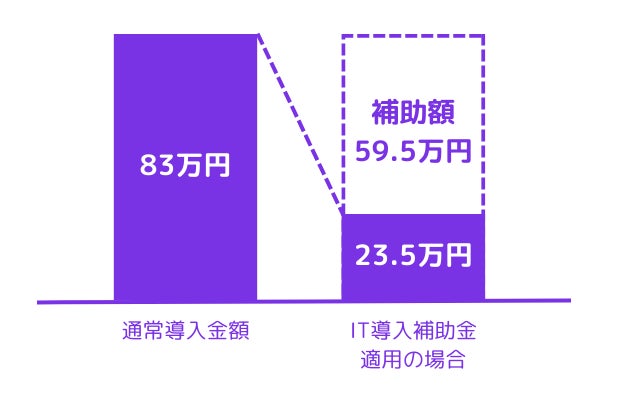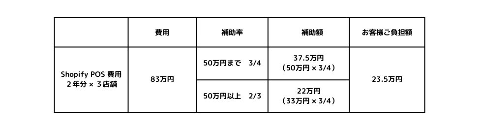ShopifyPOSの費用は3店舗 × 24か月 × 79$(1$146円換算) ≒ 83万円です。この内補助は50万円までは4分の3、50万円以上は3分の2となるので、計算すると(50万円 × 3/4)+ (33万円 × 2/3)≒ 59.5万円 が補助され、お客様の負担は23.5万円となります。