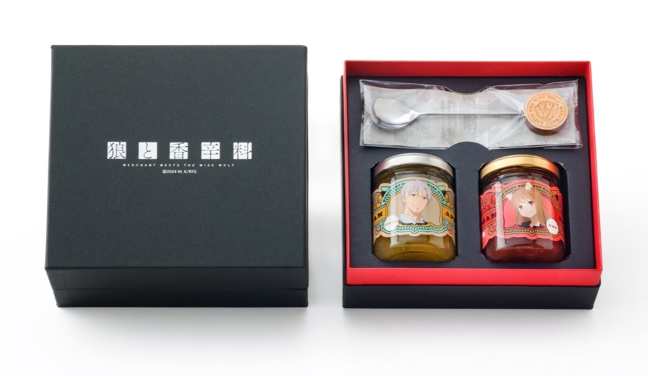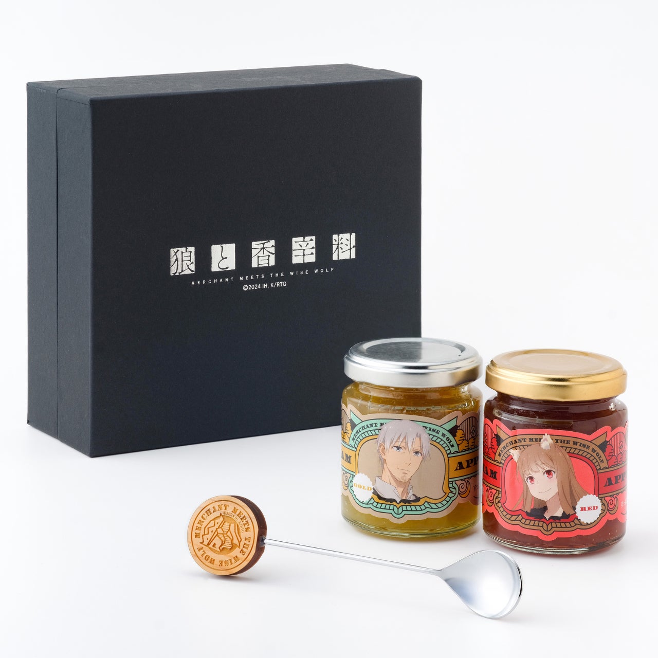 大人気アニメ「狼と香辛料 MERCHANT MEETS THE WISE WOLF」をテーマにした特別なりんごジャム2種類と、作中に何度も登場する取引通貨「トレニー銀貨」をイメージしたオリジナルティースプーンのセットです。