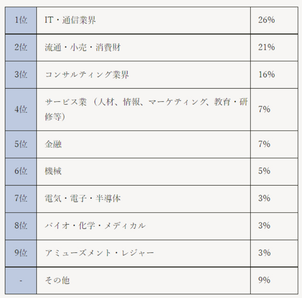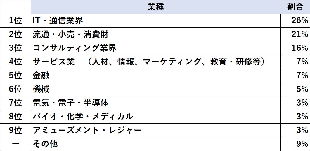 ■転職決定者 業種の分布 IT・通信業界、インターネットを介するビジネス分野が好調