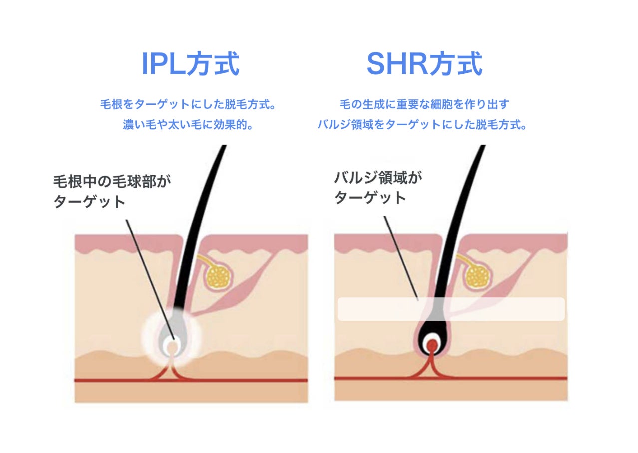 また、エステ用脱毛機の脱毛方式には「IPL方式」「SHR方式」の2種類がありますが、それ以外に「〇〇方式」とうたわれている装置メーカーもあります。それはメーカーが独自に付けた名称であり、学術的には「IPL方式」もしくは「SHR方式」のいずれかに分類されます。