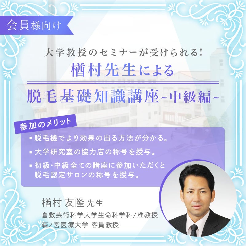 また、初級・中級講座に参加し、脱毛施術Before/After写真を提出など条件を満たした方には「大学研究室学術研究協力店」の称号を授与しております。