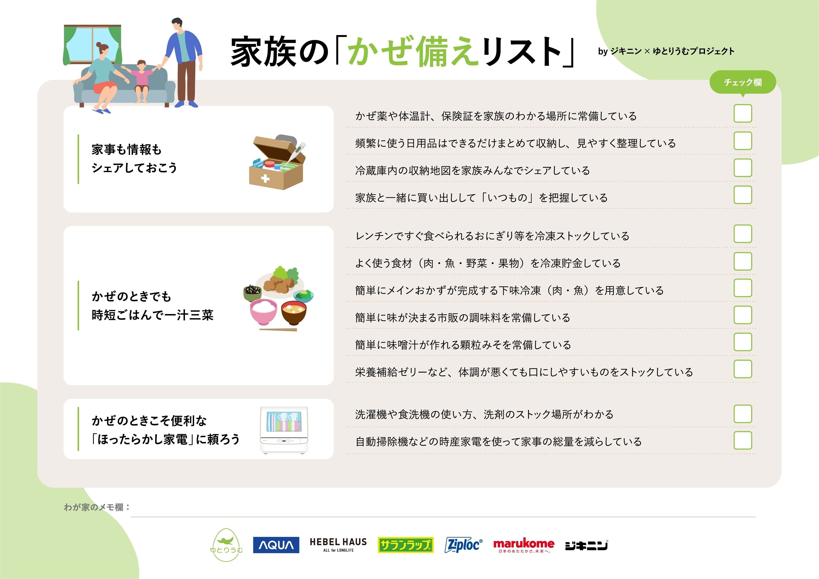 「かぜ備えプロジェクト」とは、ゆとりうむ参画企業であるかぜ薬ブランド“ジキニン”が中心となり、ゆとりうむプロジェクト参画企業他4社と共同で行っている「かぜ備え」の浸透に向けたプロジェクトです。『防災の日』に災害への備えを見直すように、年末には大掃除をするように、家族でかぜへの備えを習慣にしてもらいたいという想いから、2022年より始動しました。また、習慣化することで、ゆとりうむ3か条の「②増やそう、家事の担い手を」に繋がり、生活にゆとりをもたらします。