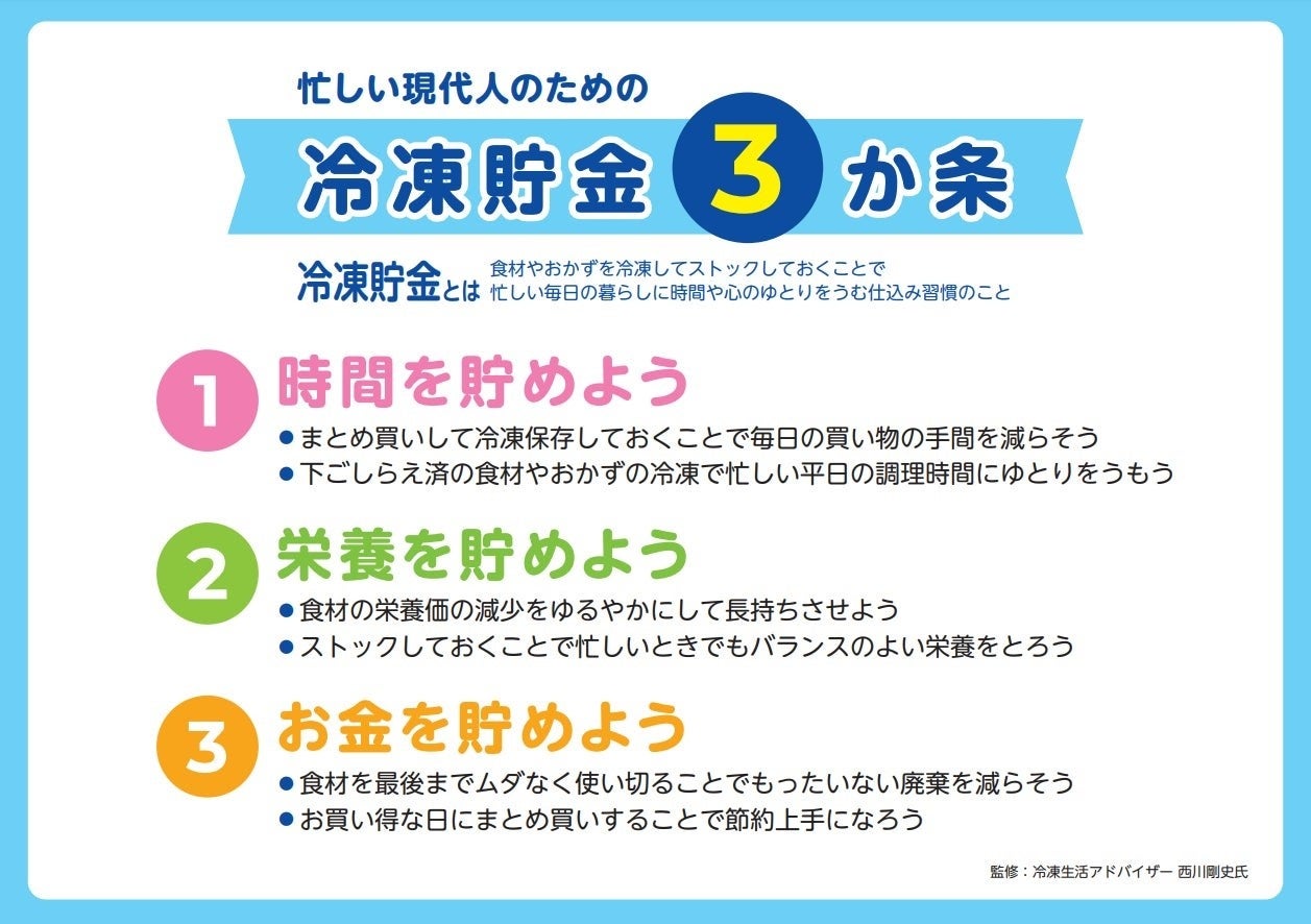 ゆとりうむプロジェクトは、旭化成ホームプロダクツ株式会社と共同で2022年春に、「冷凍貯金ラボ」を発足しました。食材やおかずを冷凍ストックしておくことで忙しい毎日の暮らしにゆとりをうむ新習慣である、「冷凍貯金」に関する様々な情報の発信母体として、様々な情報発信しています。旭化成ホームプロダクツと専門家の知見をかけ合わせて、「時間・栄養・お金」が貯められるなどの冷凍保存のメリットと共に、食材やおかずの適切な冷凍保存方法を発信しています。また、「冷凍貯金」を取り入れることで、ゆとりうむ3か条の「①減らそう、家事の総量を」に繋がり、生活にゆとりをもたらします。