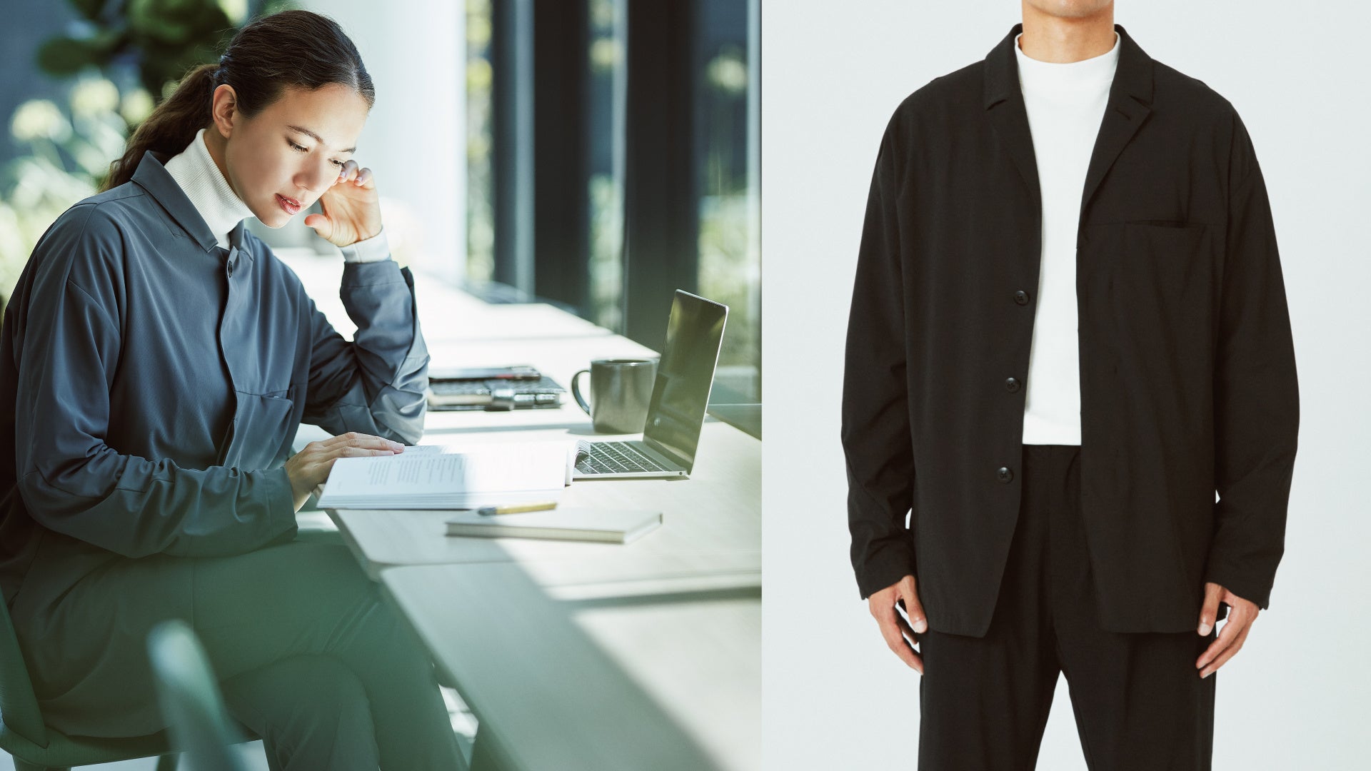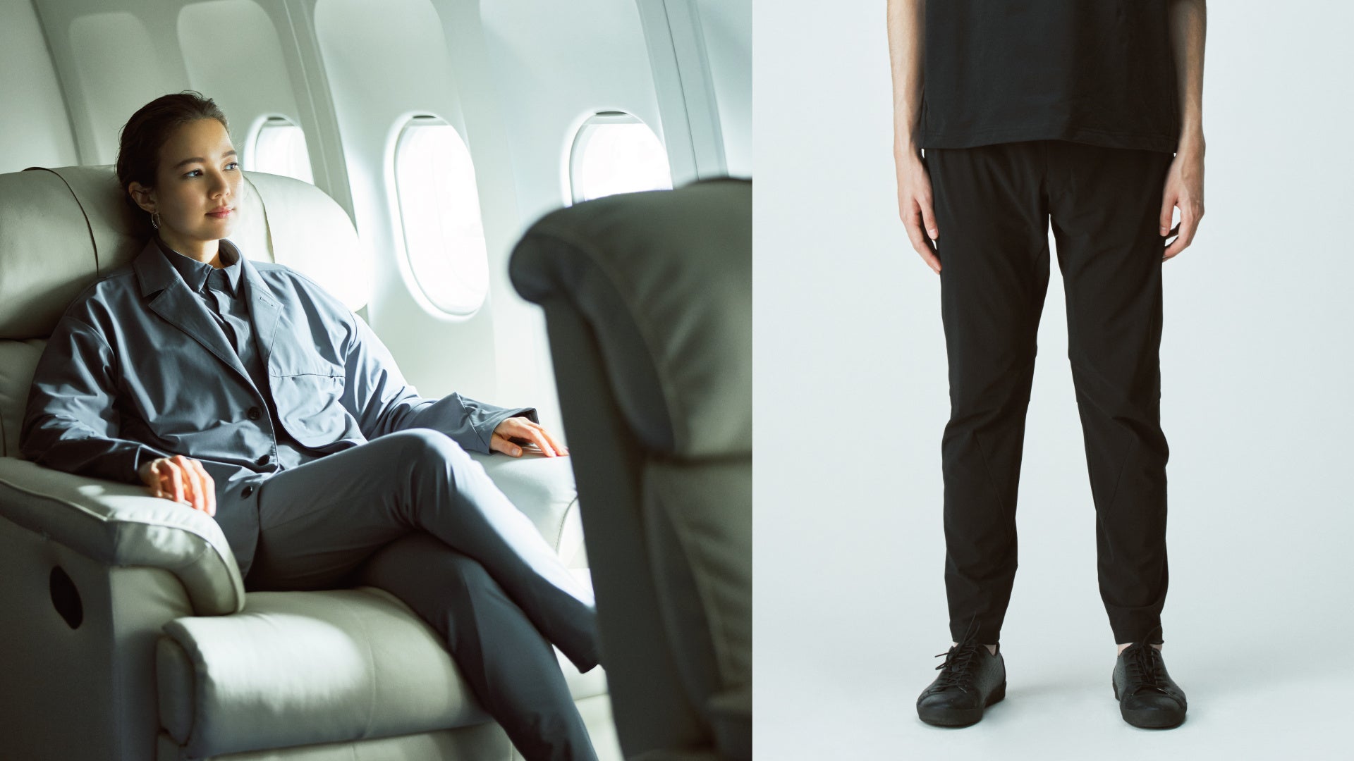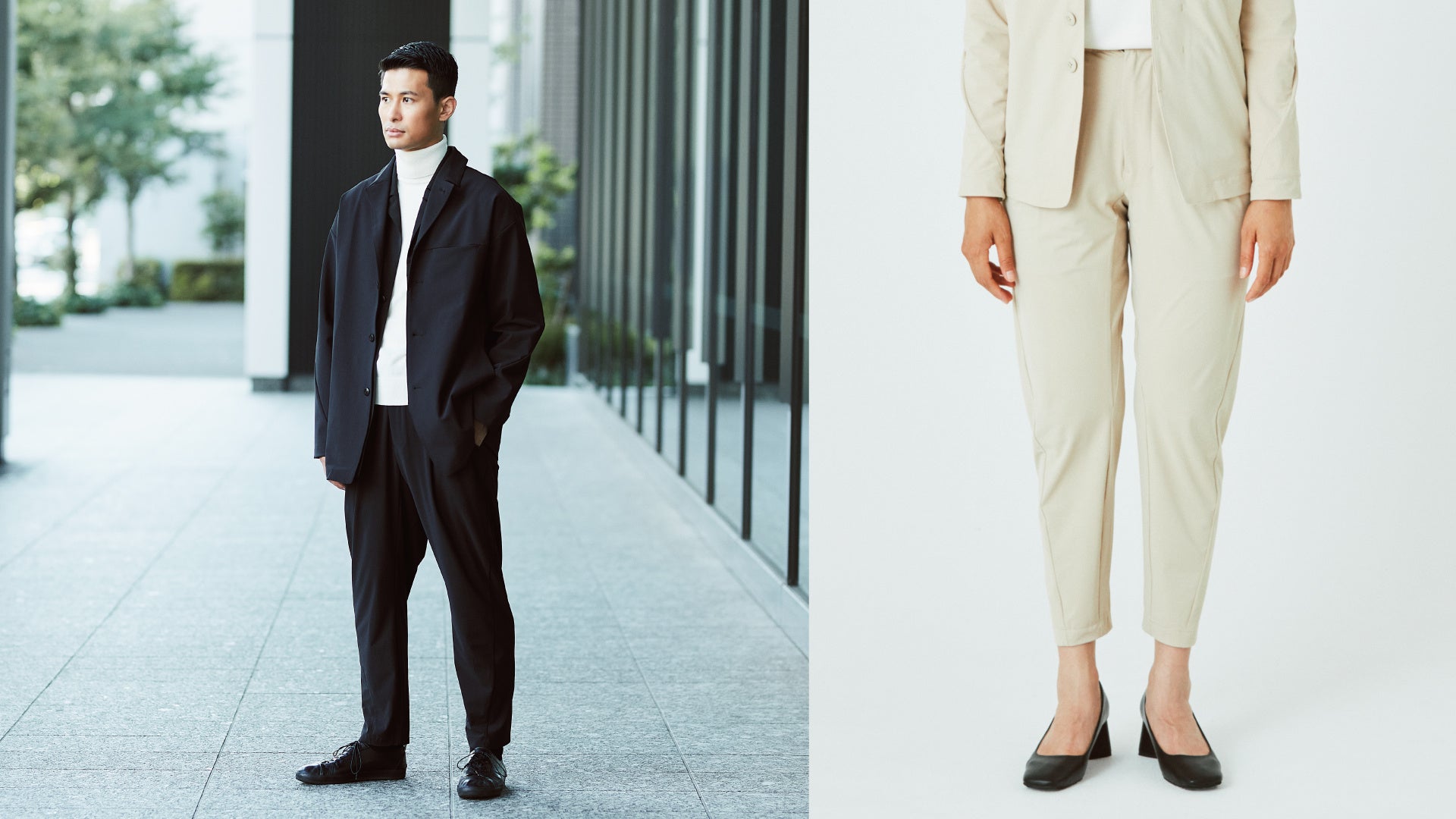 商品には軽さや着心地、イージーケアなどあらゆる負担が軽減される細かなこだわりや、撥水性・伸縮性、シワにならないなどの機能も詰め込まれています。素材にはペットボトルをリサイクルした再生ポリエステルを使用し、限定受注生産という新たな生産方式を採用する事で、アパレル業界の抱える環境課題解決にも取り組んでいます。