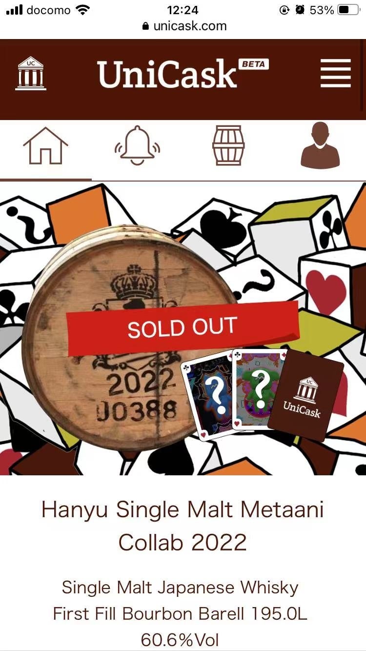 世界初&日本発、蒸留酒の樽をNFT化しての管理・取引を可能にしたUniCaskが、小口化された蒸留酒樽のNFT第二弾、シングルモルトジャパニーズウイスキー 「羽生」 2022年ビンテージの CASK NFTを「Metaani」チームとコラボした形で2022年2月16日正午に一般販売。販売開始から24分で完売しました。