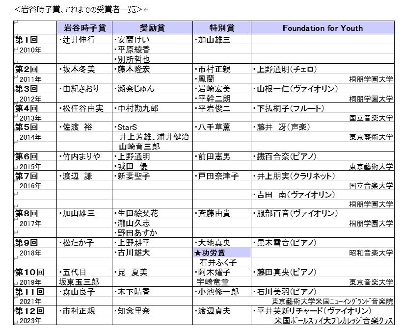 岩谷時子賞に大竹しのぶ様(俳優)、岩谷時子賞特別賞にクミコ様(シャンソン歌手) 、岩谷時子賞奨励賞に海宝直人様 (俳優・シンガー)、岩谷時子 Foundation for Youthにヴァイオリニストの落合真子様、東亮汰様を選出いたしました。