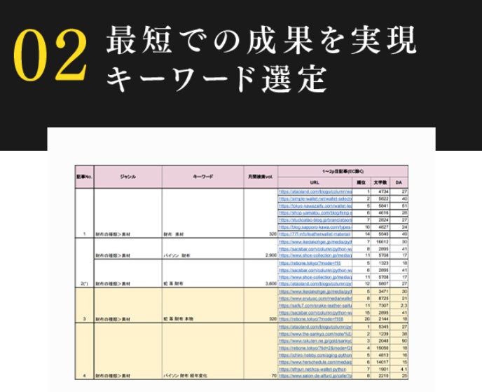 キーワードのボリューム、競合記事の順位‧文字数‧DAを調査/分析し、必要文字数や効果的な構成‧タイトルを設計していきます。