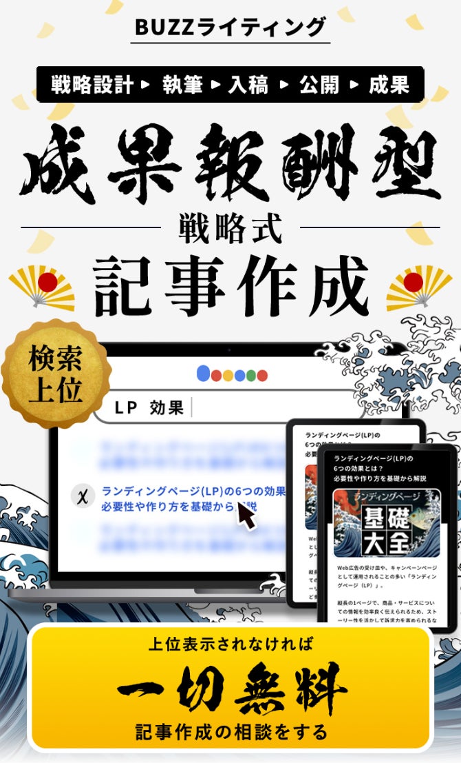 「BUZZライティング」は、成果報酬型のSEO記事制作・記事作成代行サービスです。全体戦略設計~記事執筆~入稿作業~公開~効果測定まで、一気通貫で行います。