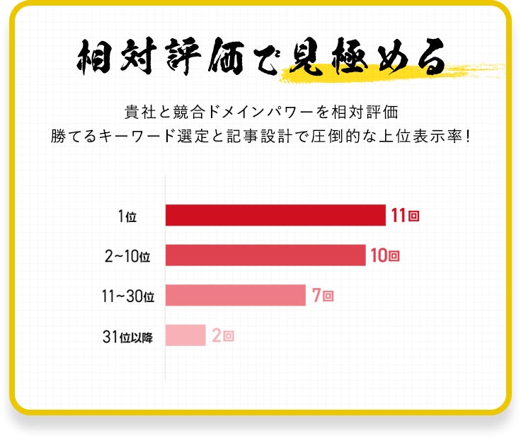 勝てるキーワード選定と記事設計で、圧倒的な上位表示率を誇ります!