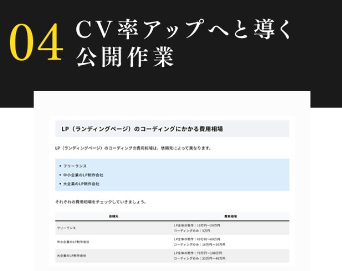 見出し・本文・ディスクリプションをはじめ、各種重要タグまで正しく設定し、上位表示に必要な要素を満たします。ユーザーの離脱率を下げるため、文字装飾やリスト・表・画像なども適宜挿入。また、事前設計に基づいてカテゴリやタグを設定しで記事同士の繋がりを強め、サイト内の回遊率を高め、CVまで導きます。