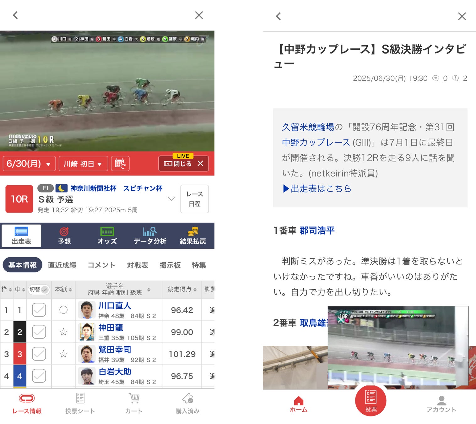 レースのライブ中継はもちろん、過去レースのダイジェスト映像も出走表からかんたんに見られるようになりました。アプリ版では、ピクチャインピクチャ機能で、レース映像を見ながらnetkeirinのニュース記事や、その他アプリを閲覧する事も可能です。