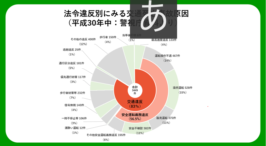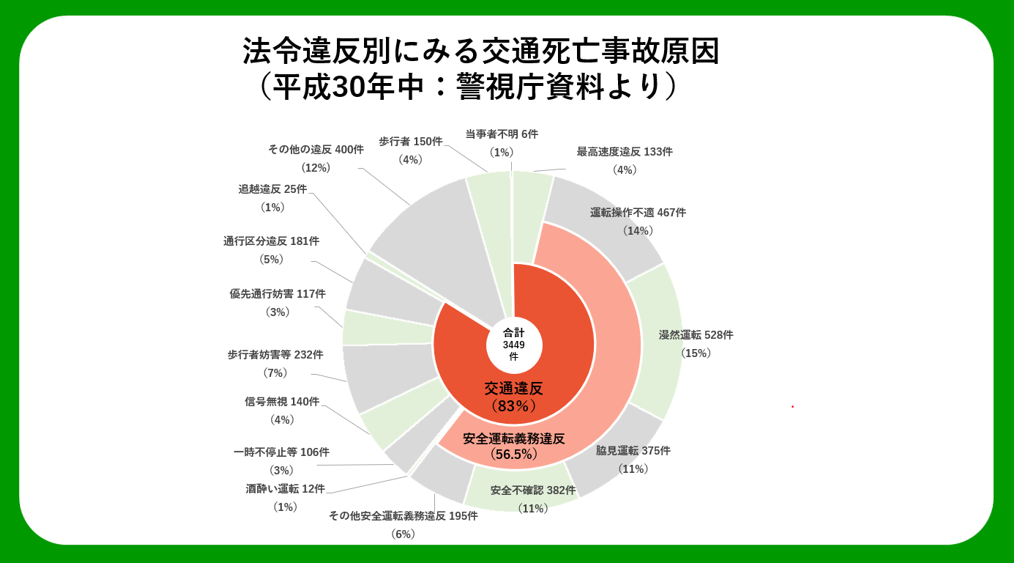 しかしそれ以上に多いのが交通違反に起因する死亡事故です。全死亡事故の割合のうちおよそ8割がドライバーの交通違反によるものとされています。