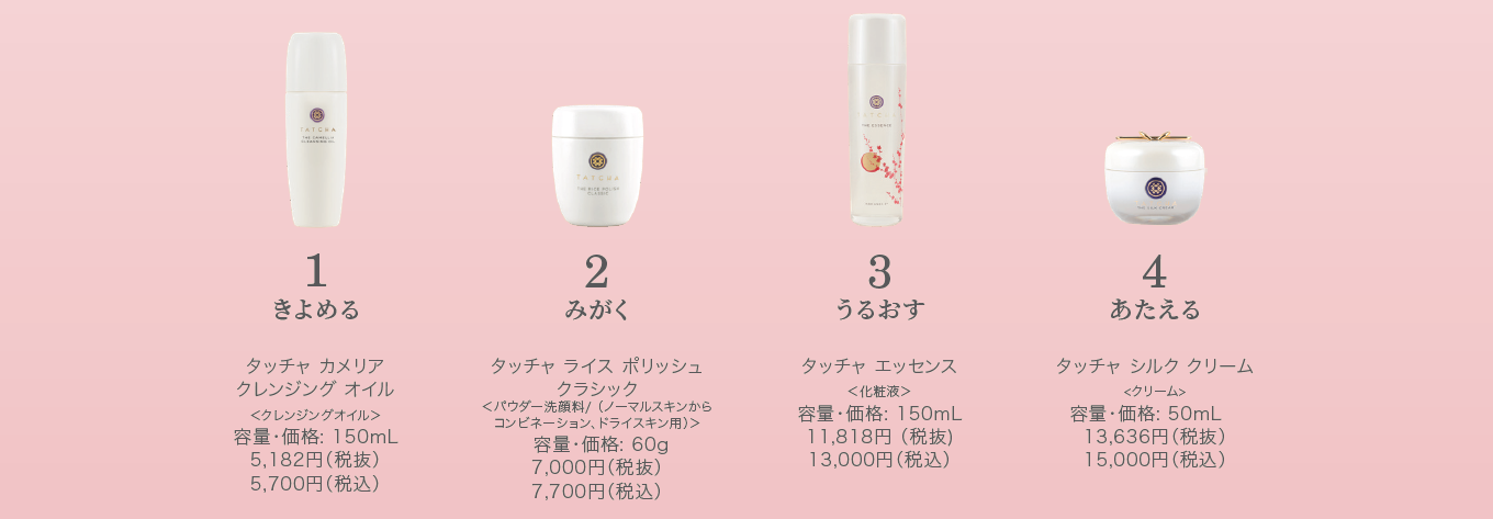 自分自身と向き合い、その時間を愛しむことの大切さを日本から教わった創始者ヴィッキー・ツァイは、タッチャの ブランドフィロソフィーとして「HARMONY FROM SKIN TO SOUL」(「この肌と、こころに、美しい和を。」)を掲げ、「スキンケアとはセルフケア」である事を伝えたいと考えました。肌と向き合う時間は、自分自身の心と深くつながる時間であり、美しさを育む大切なものと考える事からタッチャは、スキンケアのステップをリチュアル(「作法」)として 定義し、朝と夜の4つのステップからなるお手入れを提案しています。