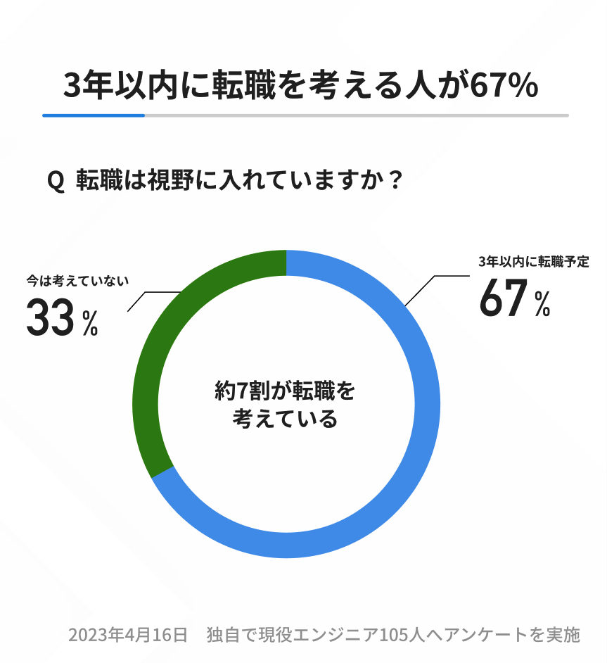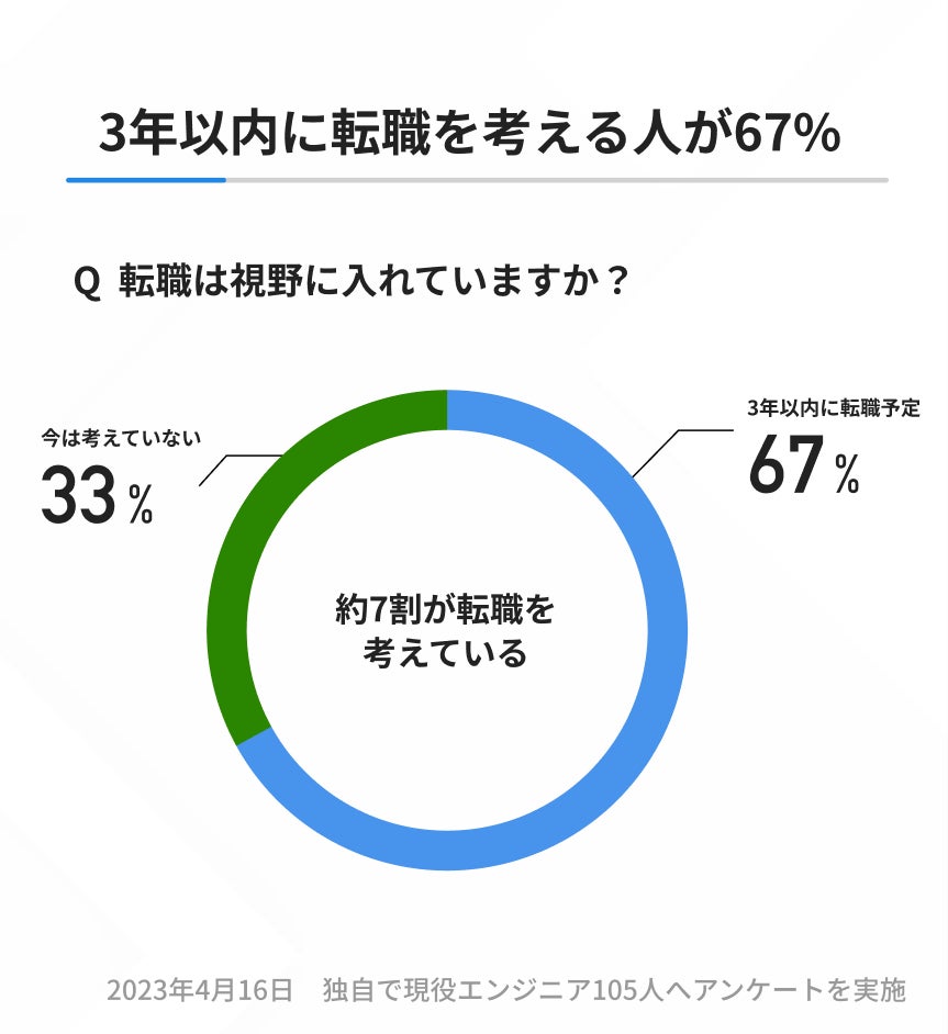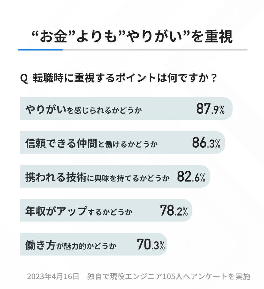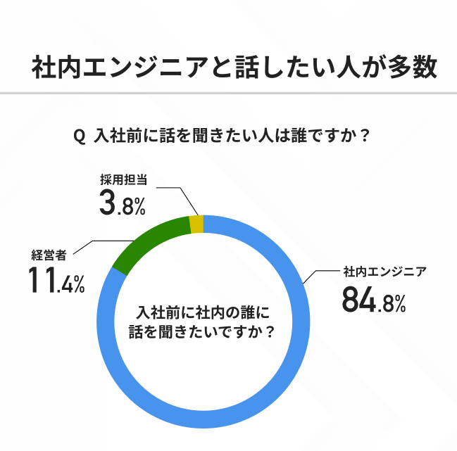 現役ITエンジニア100名への独自調査では、転職時に重視するポイントは「やりがい」や「信頼できる仲間」という結果でした。それゆえ、実際に働く企業内エンジニアに話を聞いた上で転職を考えたいという方が84%もいます。しかし、今の採用市場では興味のある企業で働く企業内エンジニアに気軽に話を聞ける環境はありません。