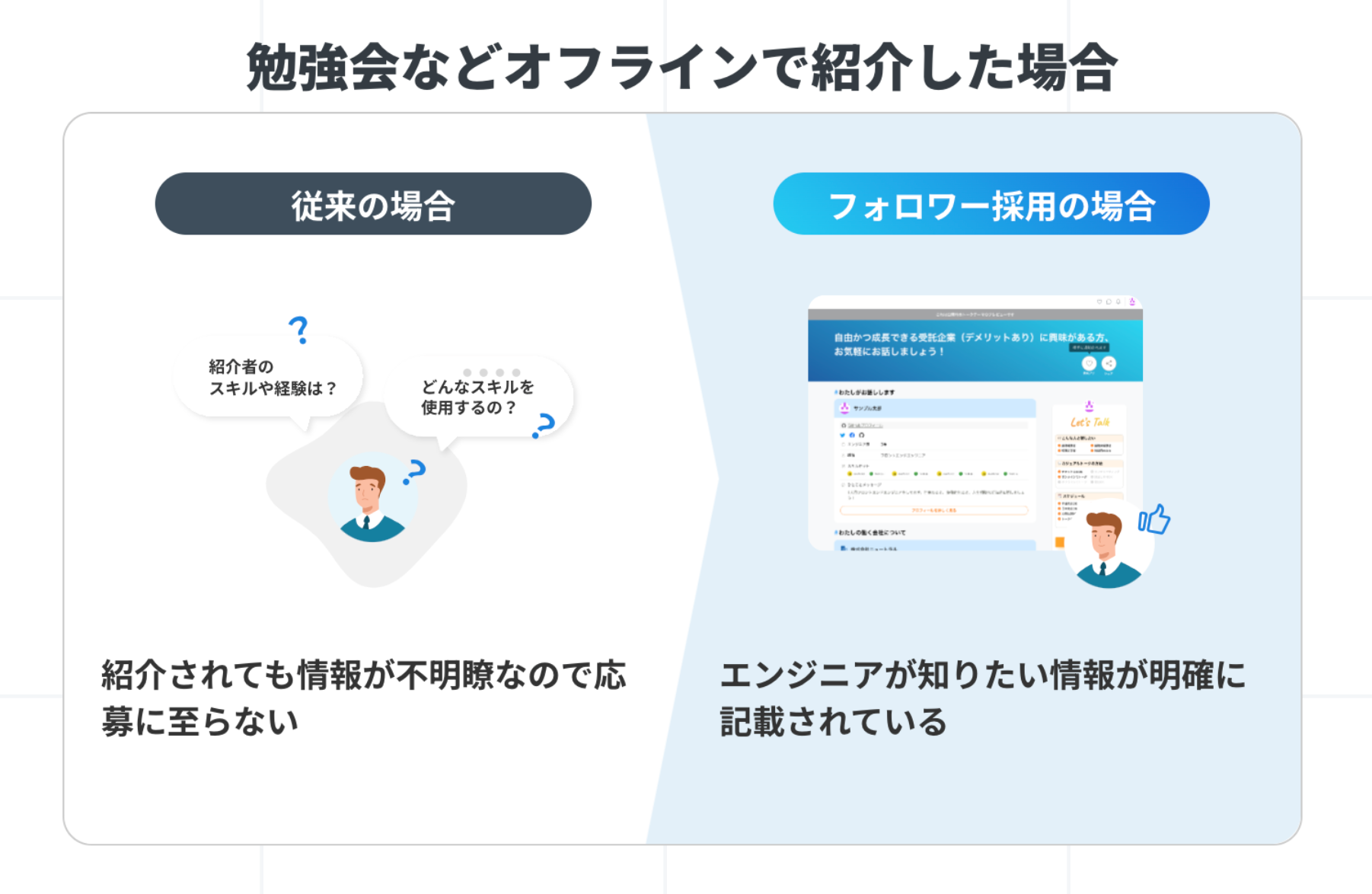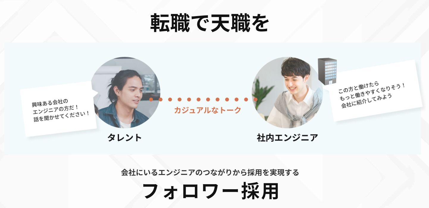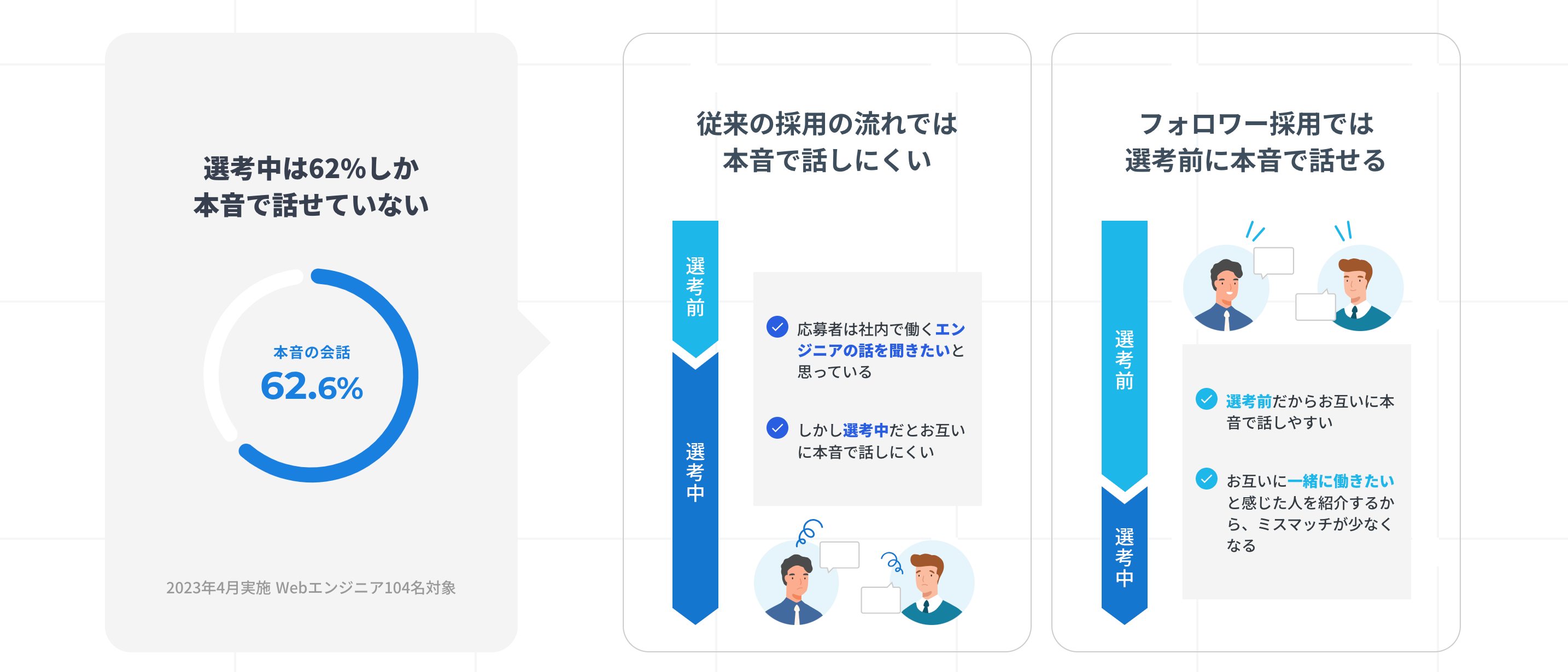 そこで、フォロワー採用では、選考前に社内エンジニアとカジュアルに話すことで、会社のカルチャーに本気で共感した状態で選考に進める仕組みを提供しています。