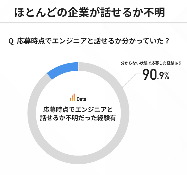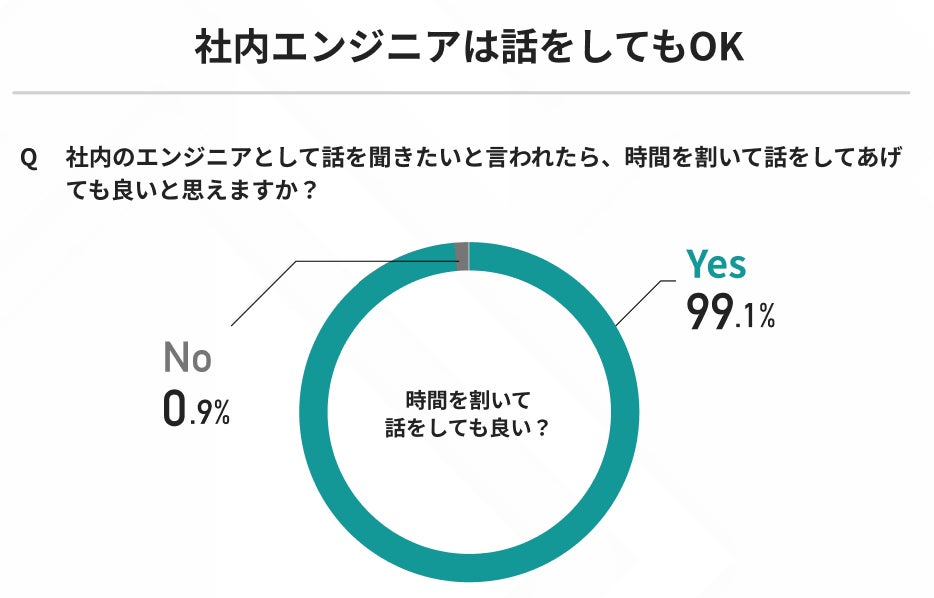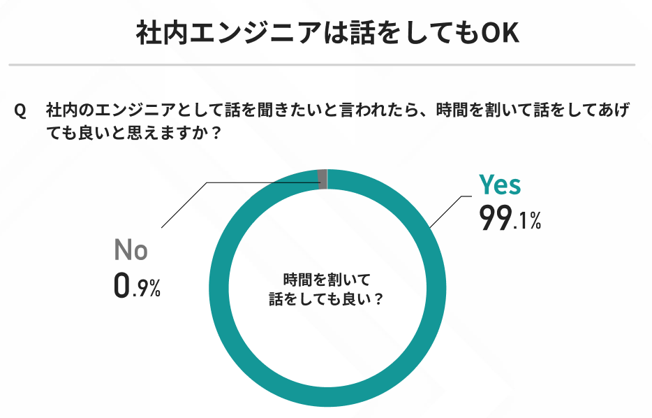 一方で、社内エンジニアは、外部からのヒアリング依頼に対して99%の人が話をしても良いと回答していることがわかりました※。※ニュートラル社の独自調査(N=100)
