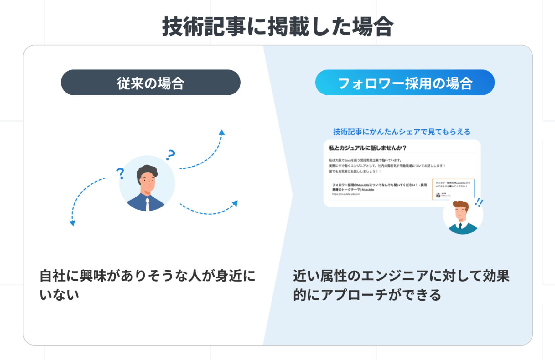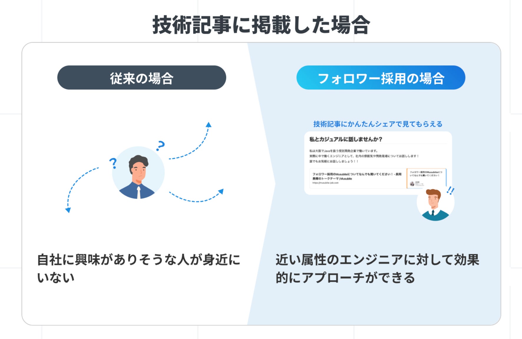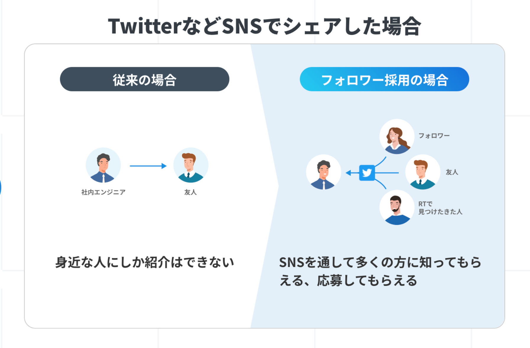 フォロワー採用は従来のリファラル採用が抱えていた課題である「紹介できる人がいない」「エンジニアが話しかけにいくハードルが高い」「紹介の責任が重い」を改善することで、今までにはない新しい採用のカタチを実現しています。