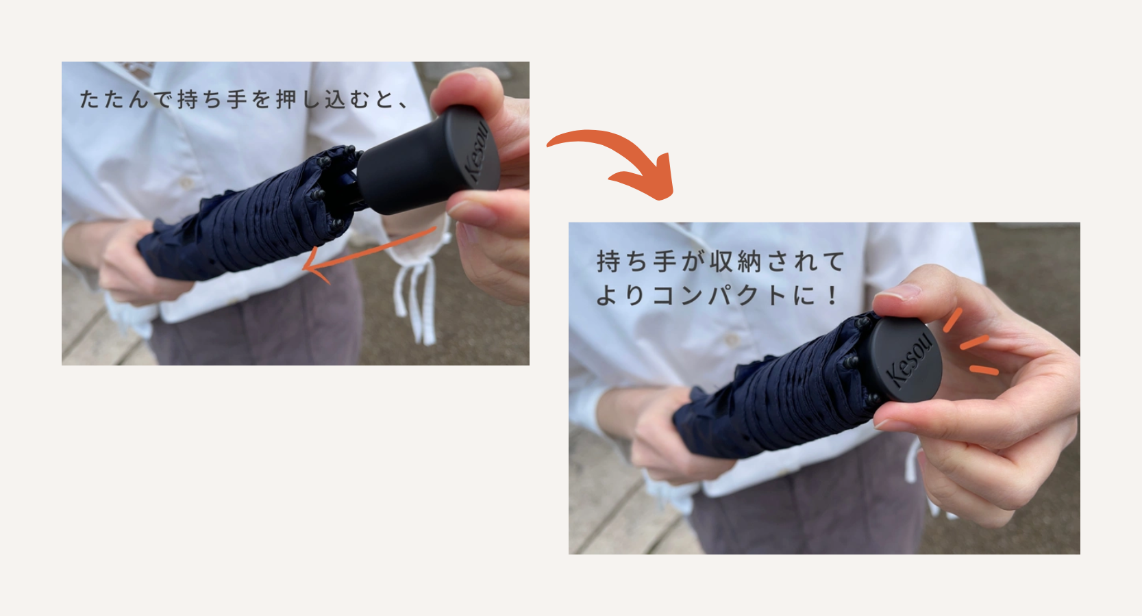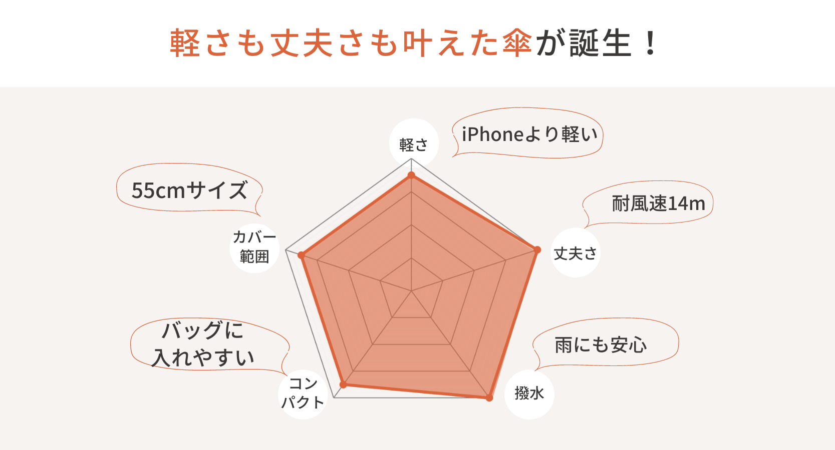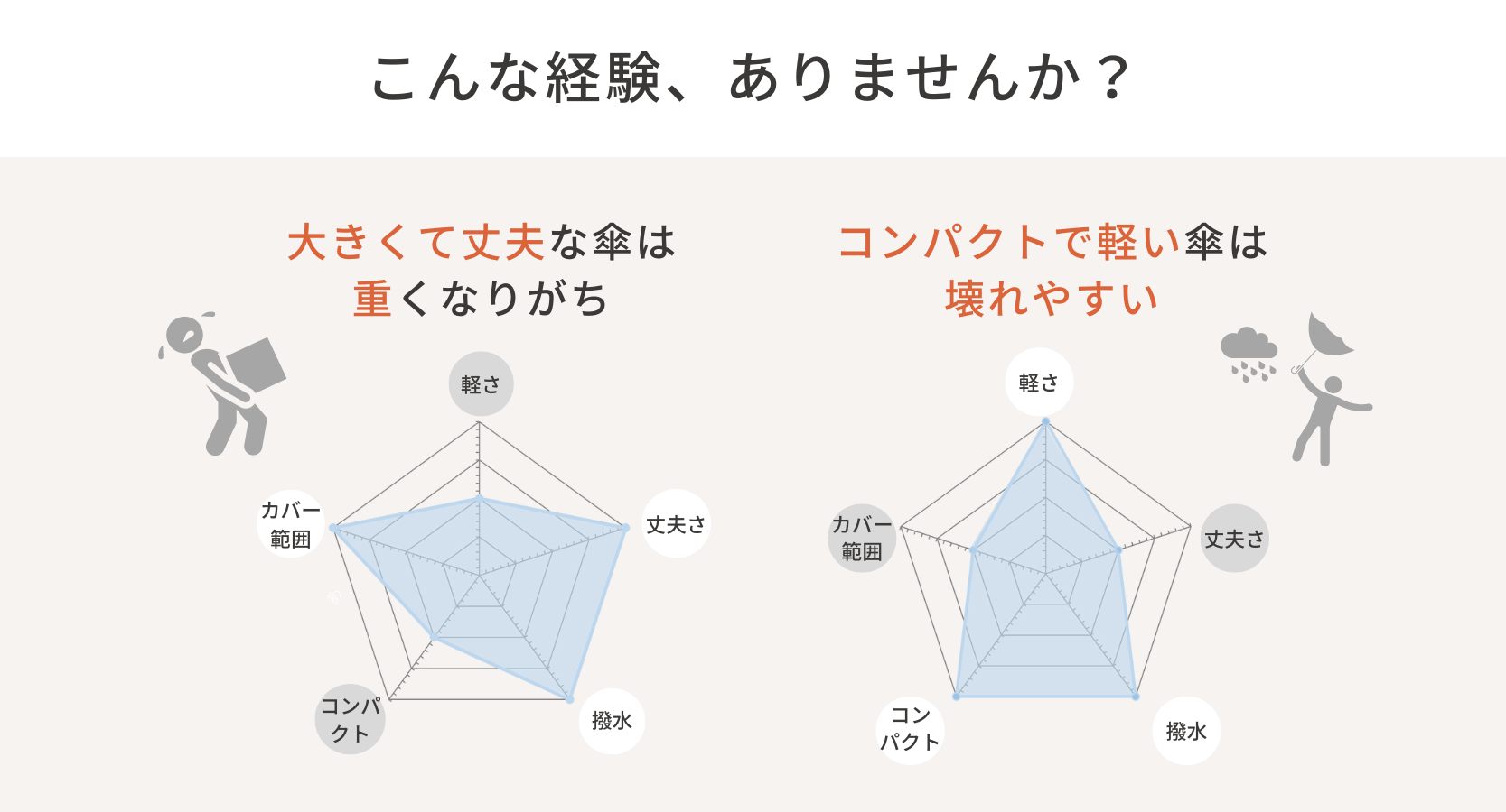 重い傘は持ち歩きにくいからと、軽量化を進めると、カバー範囲が狭くなったり、壊れやすくなったり…そこでKesouが目指したのは軽さも丈夫さも妥協をしない折りたたみ傘です。