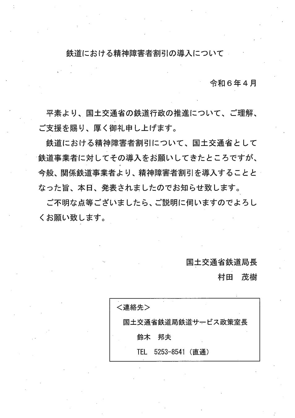 これを受け、同年6月11日には、「真の共生社会実現に向けた新たなバリアフリーの取組」という国土交通大臣指示がだされ、公共交通機関における精神障がい者割引の導入促進が打ち出されたのです。