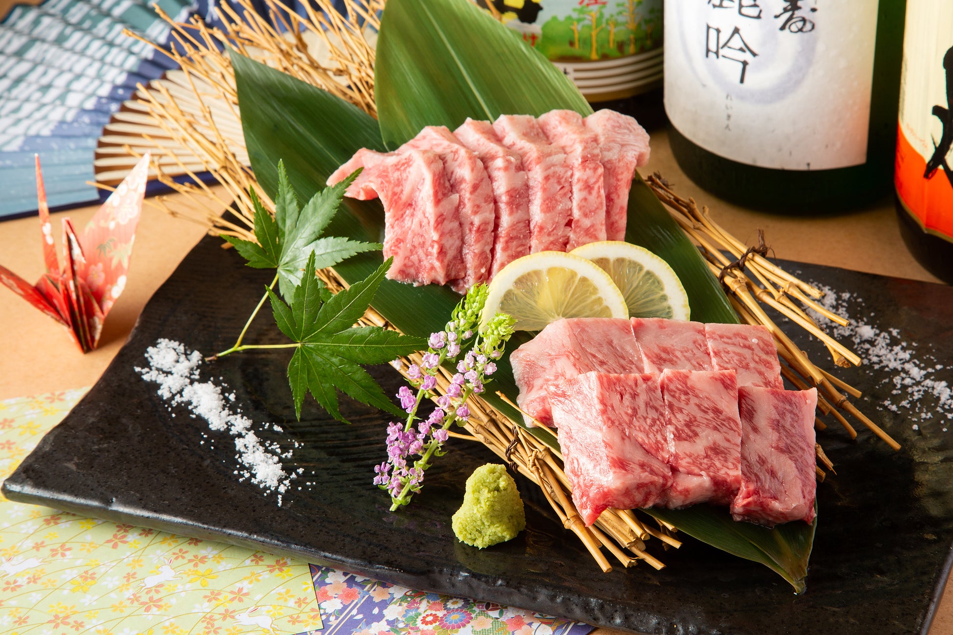 九州産の黒毛和牛サーロインと生本マグロを使用した断面刺しはインパクト抜群!